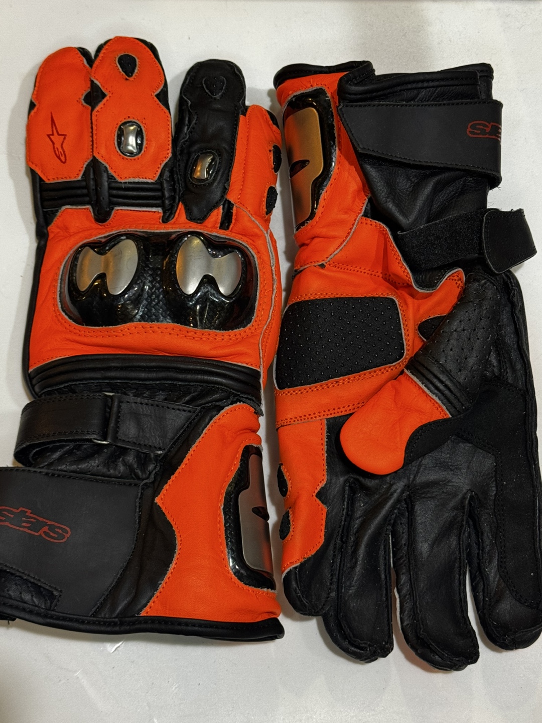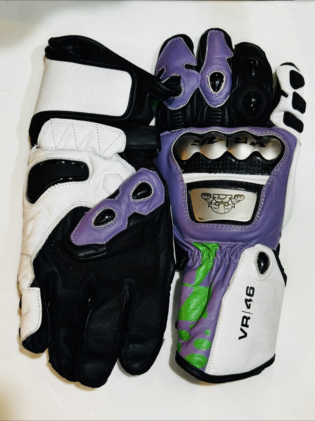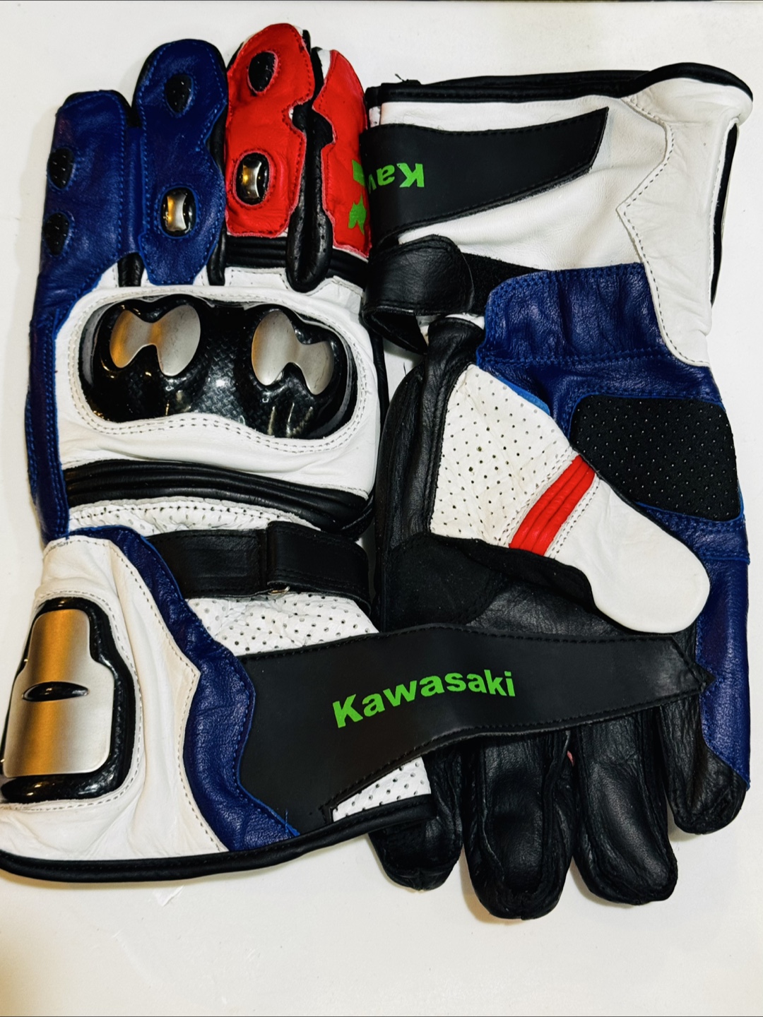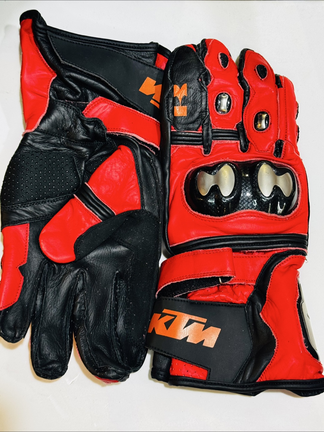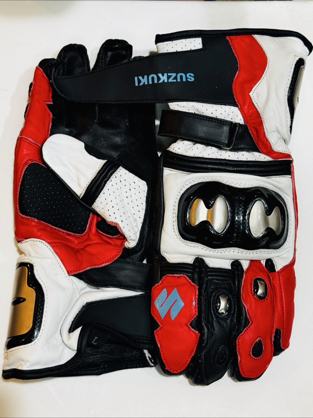 Motorcycle gloves in various colours and designs. Some have knuckle protection and wrist straps. You can use these to feel more secure while on the road.