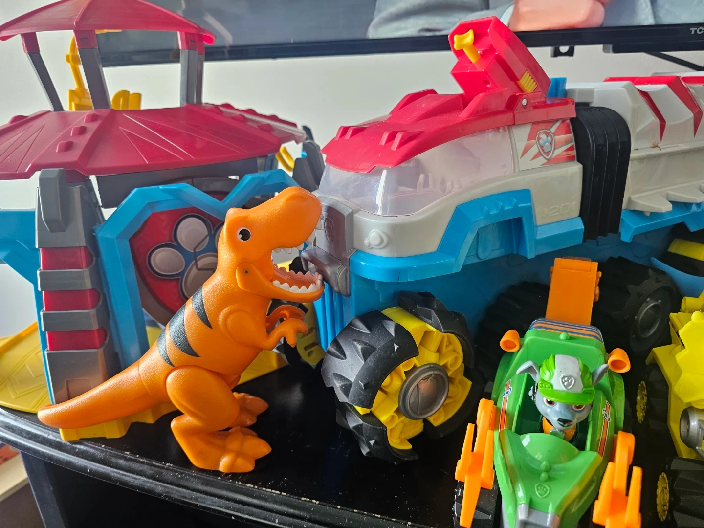 Rex and 2 vehicles. 1 smaller that comes with the tower and one larger that can be extended for height like a monster truck