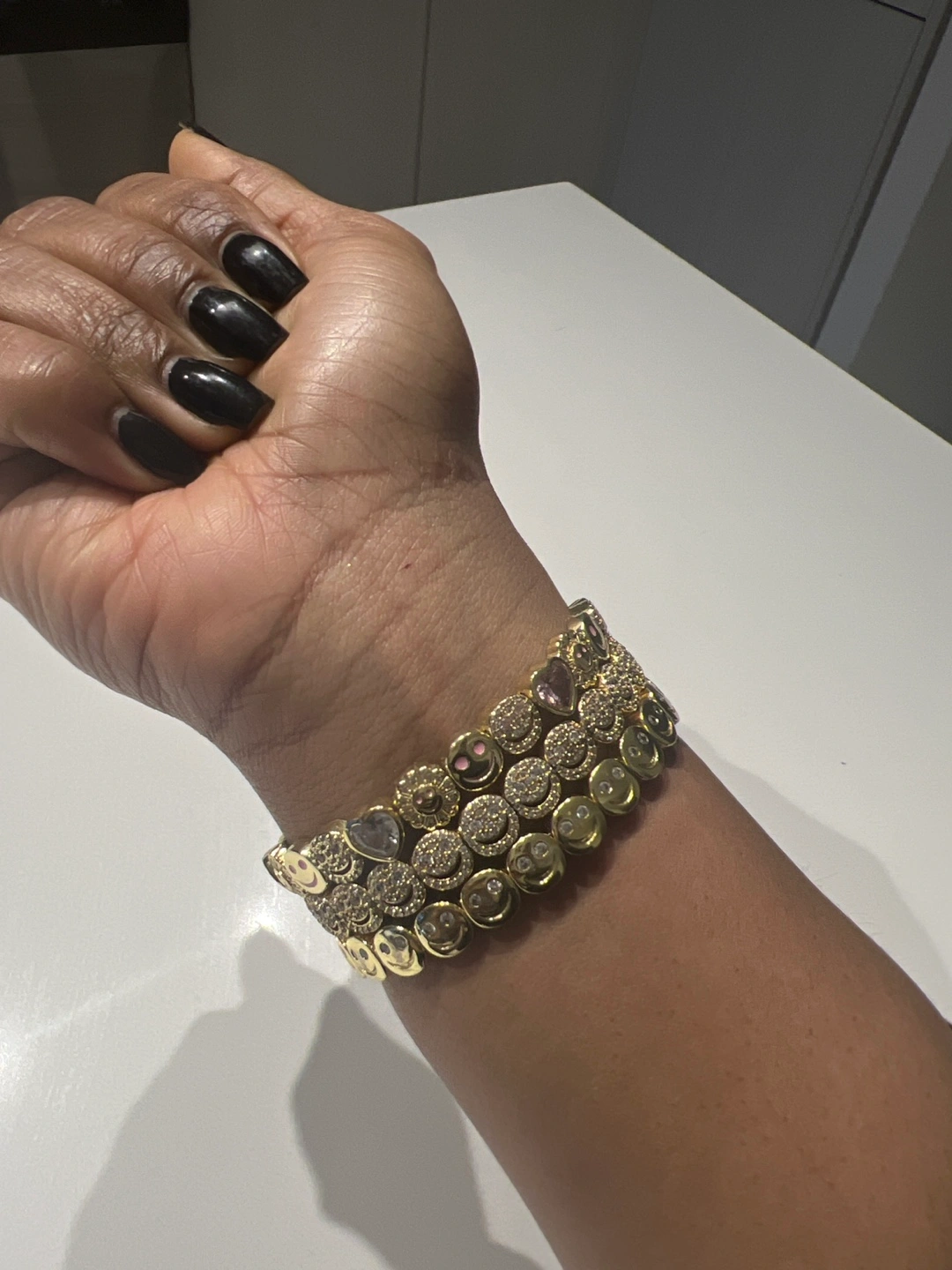 Three stretchy bracelets. Gold-toned metal. Features smiley faces and other small charms. Good condition.
