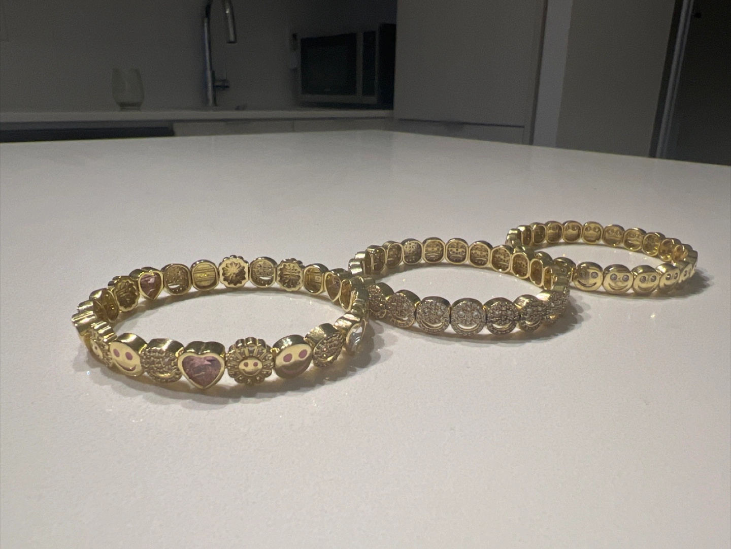 Three stretchy bracelets. Gold-toned metal. Features smiley faces and other small charms. Good condition.