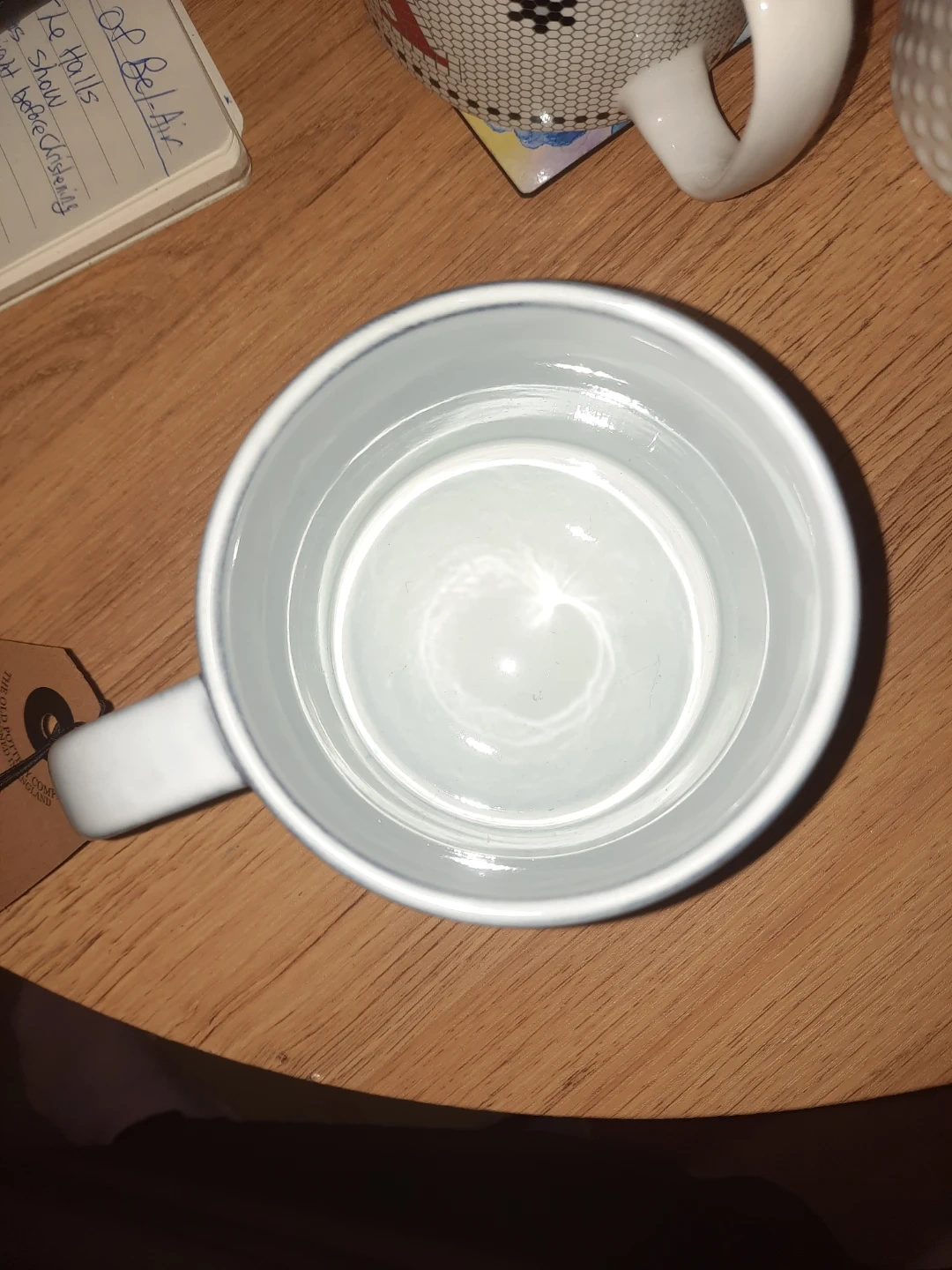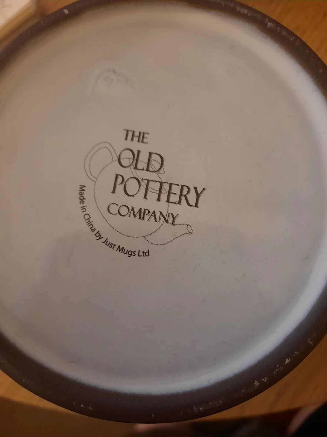 Color: The main body of the mug has a light, pale blue or off-white glaze with a darker rim.
