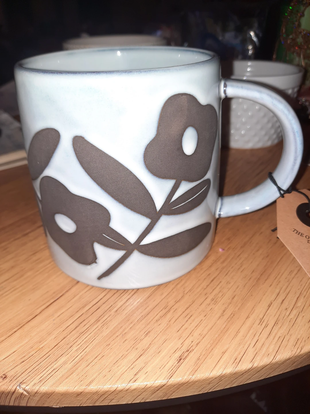 Design: The mug features a stylized, dark brown floral pattern, likely applied as a decal or underglaze decoration.
