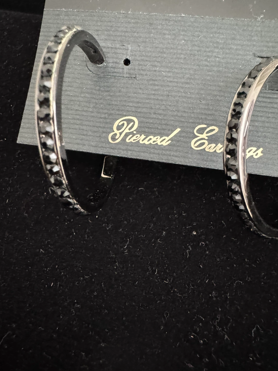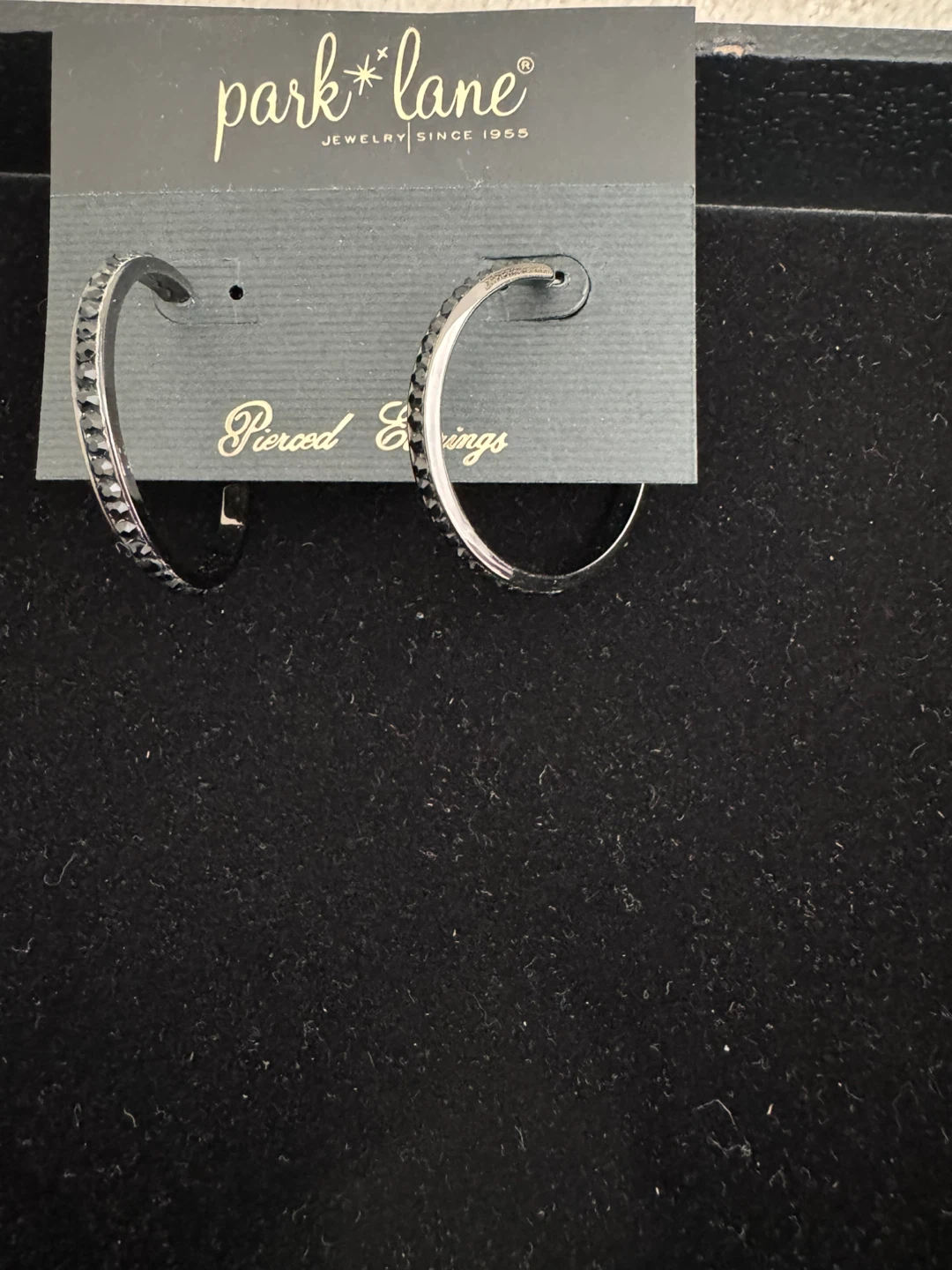 Park Lane hoop earrings with a black-tone finish. They're decorated with black rhinestones for a bit of sparkle. These are designed for pierced ears.