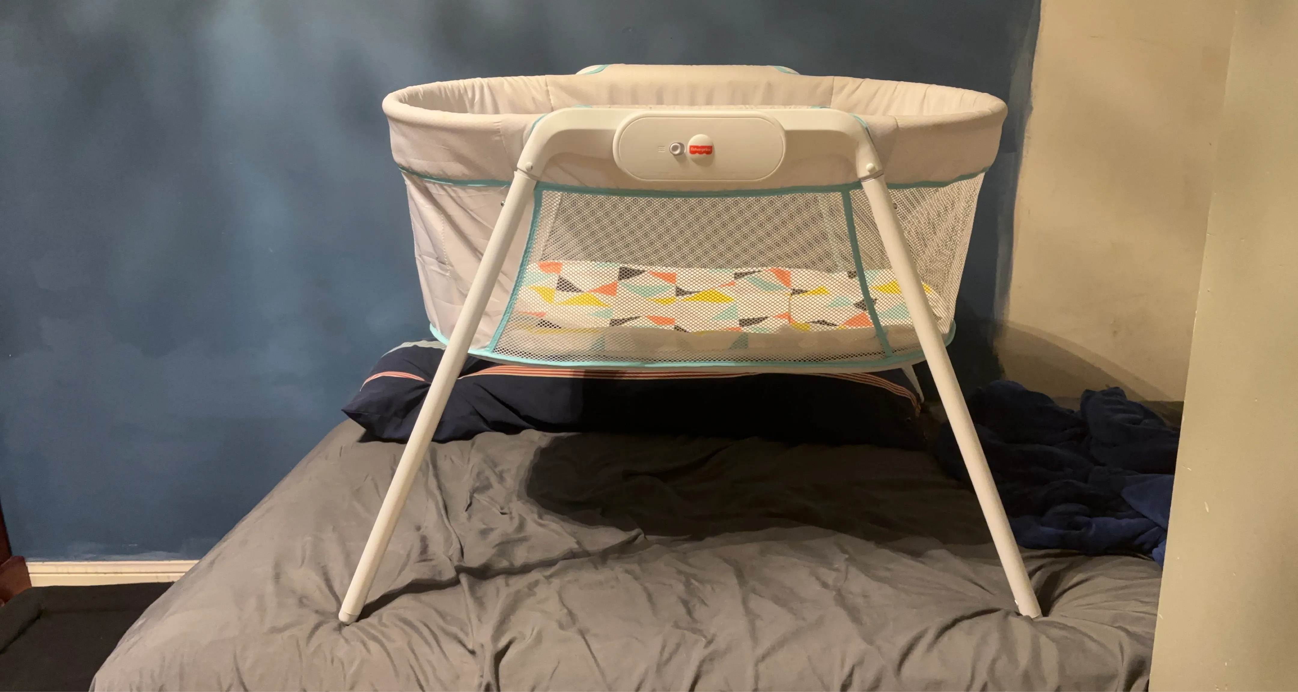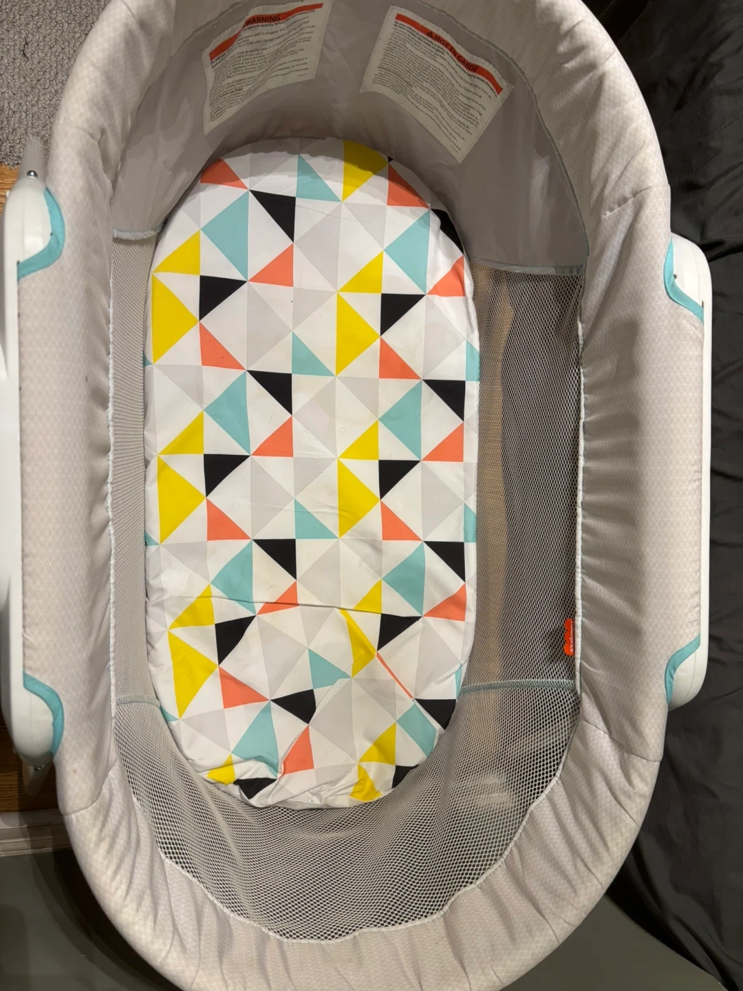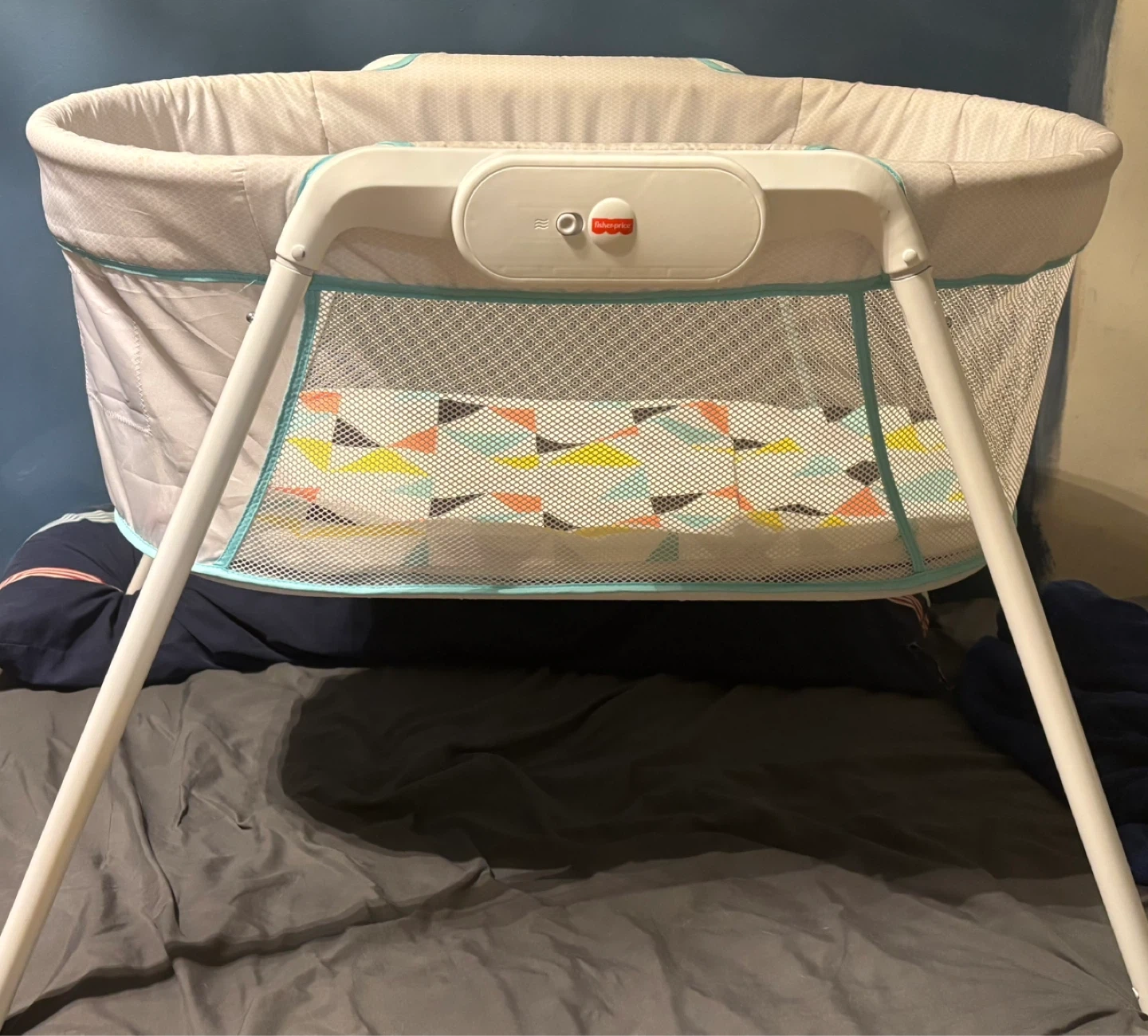 This Fisher-Price bassinet has a grey patterned fabric with teal trim. It features mesh sides for airflow and a colourful geometric-patterned mattress. Perfect for keeping your little one close by!