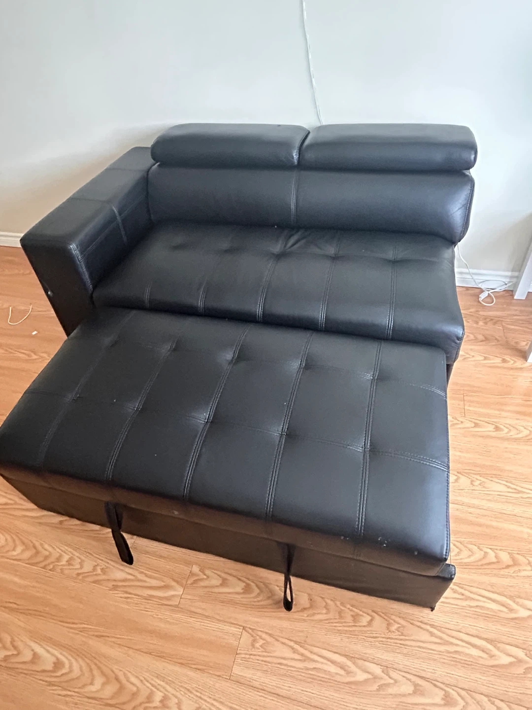 This black faux leather loveseat easily converts into a sofa bed. It's designed for comfort and functionality. This piece is great for small spaces or guest rooms!