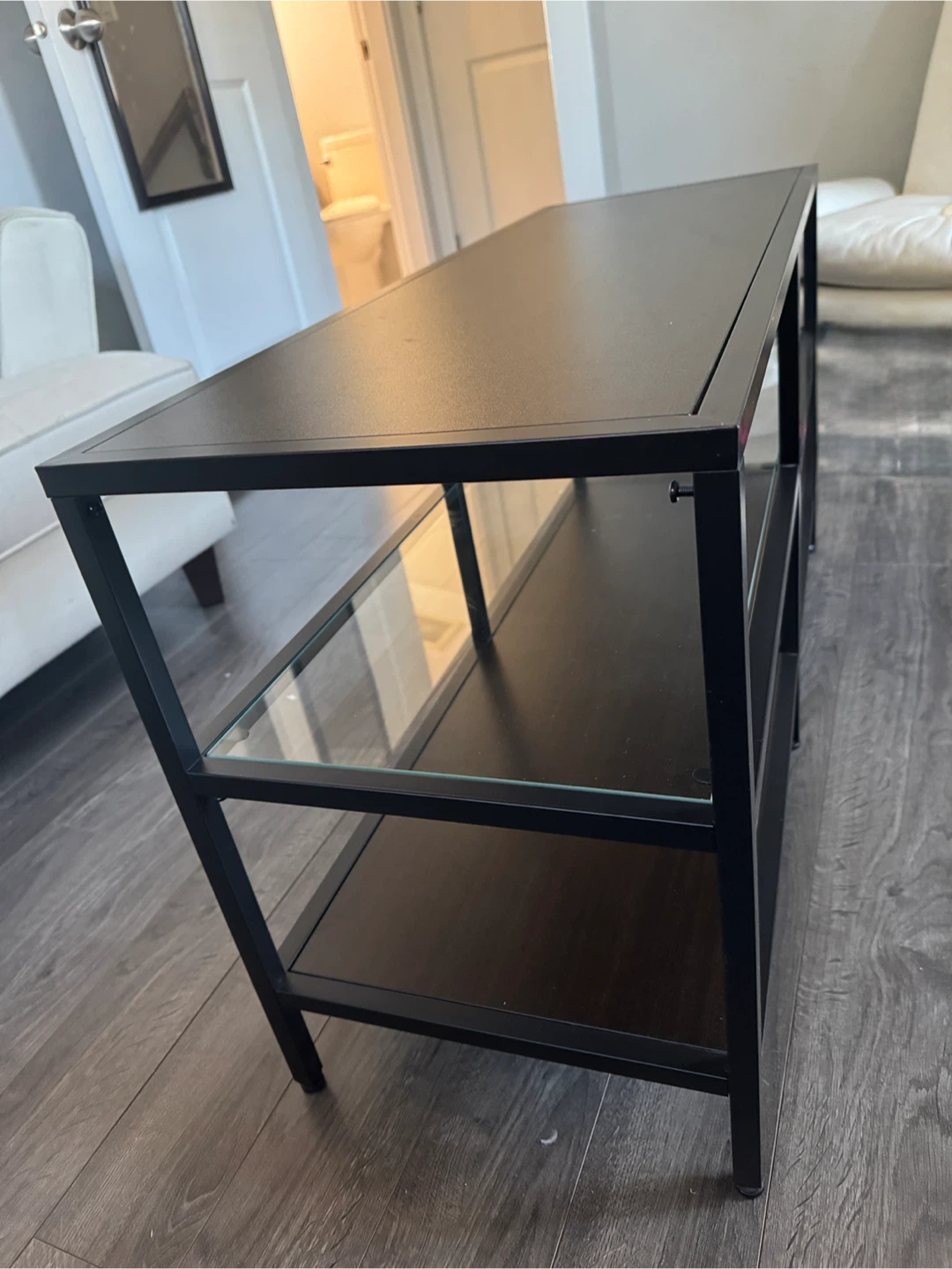 Stylish and sturdy TV bench/shelf / storage unit, with a sleek mixed-material design. The top and bottom shelves is wood, paired with a glass middle shelf and a durable metal frame.