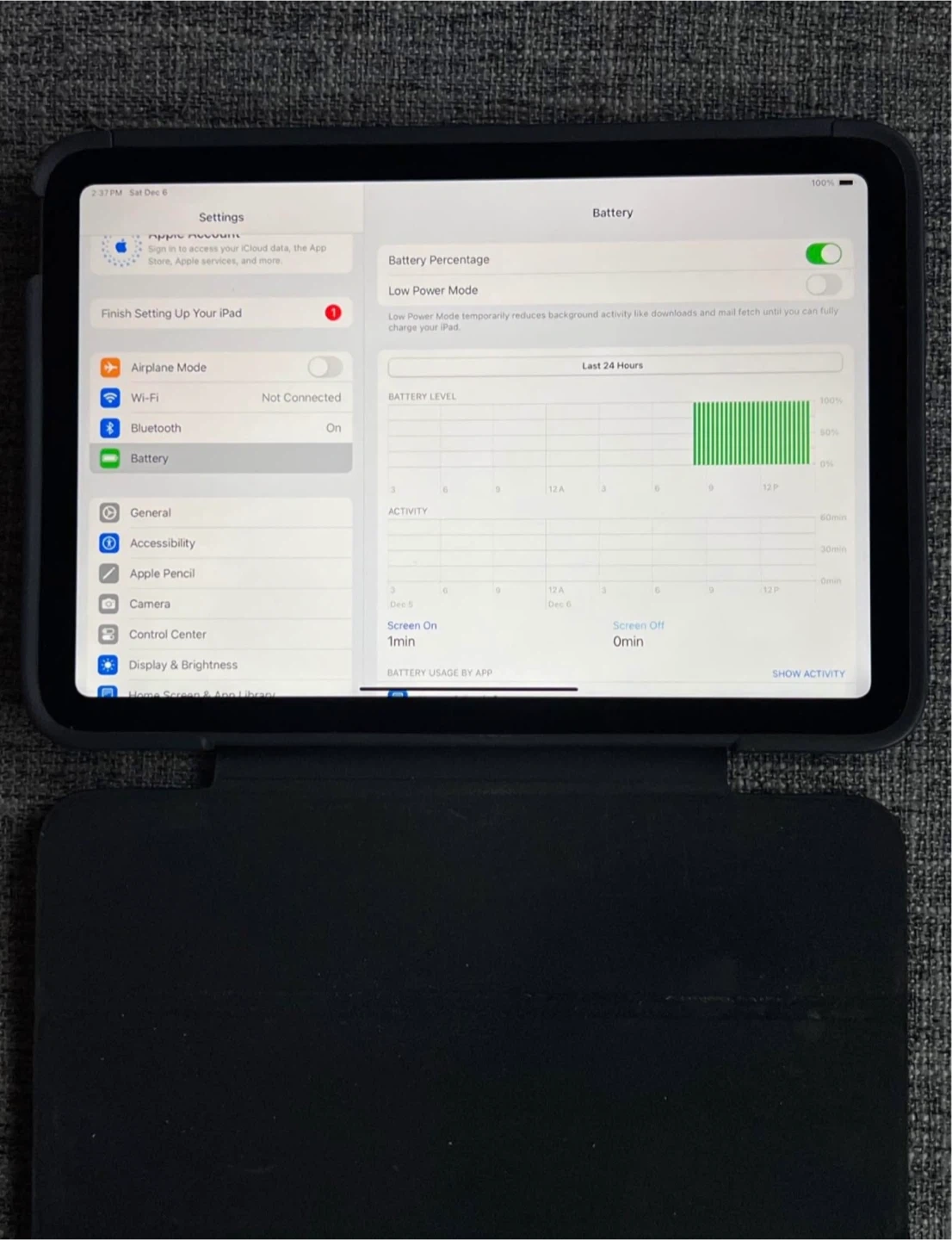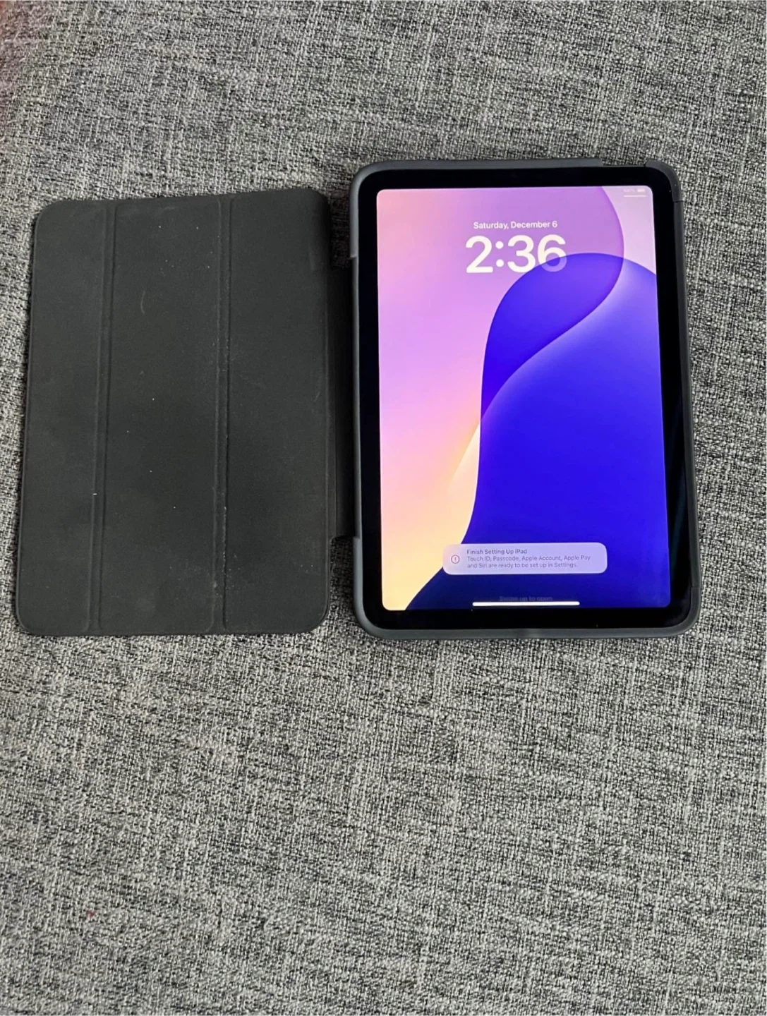 This is an Apple iPad Mini, charcoal grey colour, and it comes with a black case. It's in good working condition. Perfect for browsing, emails, and apps!