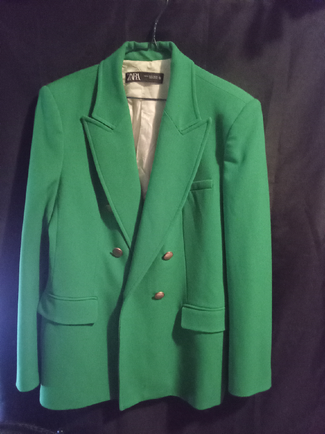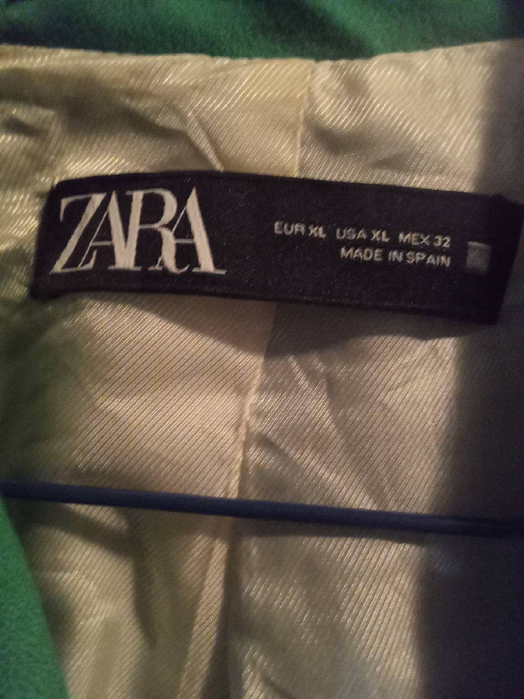 Selling a Zara blazer in a vibrant green colour. It's a size XL and made in Spain. The blazer features a double-breasted design with bronze-toned buttons. A stylish addition to any wardrobe!
