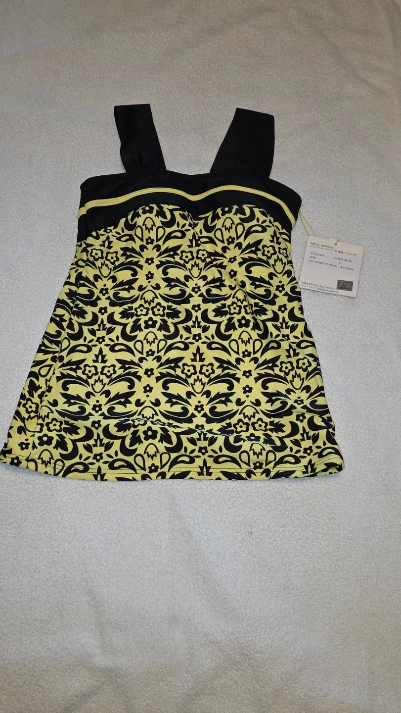 swim top features a yellow and black damask pattern. It offers UV protection for sunny days. Built-in bra with adjustable straps.