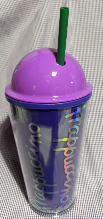 Selling a Starbucks purple tumbler that's perfect for keeping your drinks cold on the go! It comes with a reusable straw and has a fun design on the side. Great for iced coffee, smoothies, or any cold beverage you like.