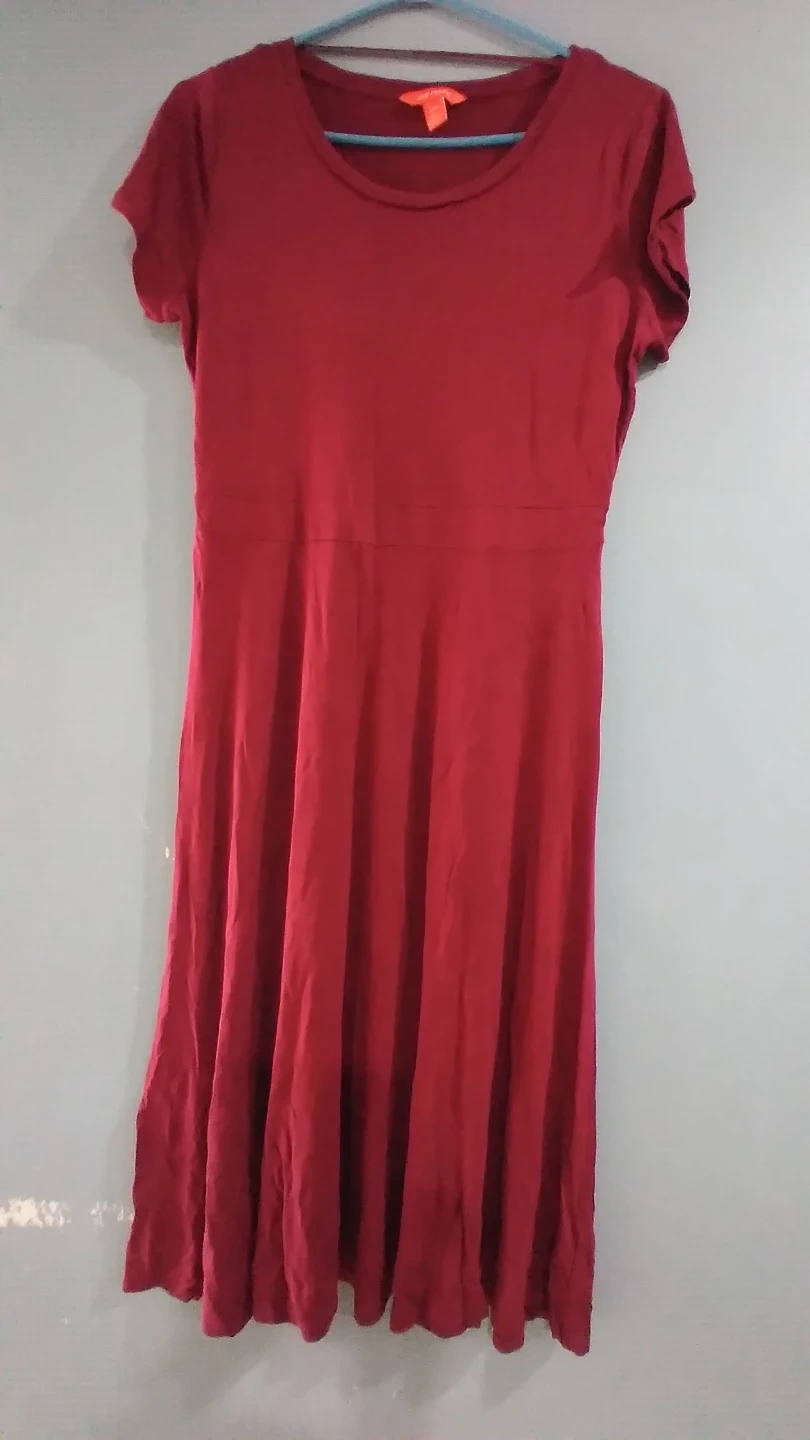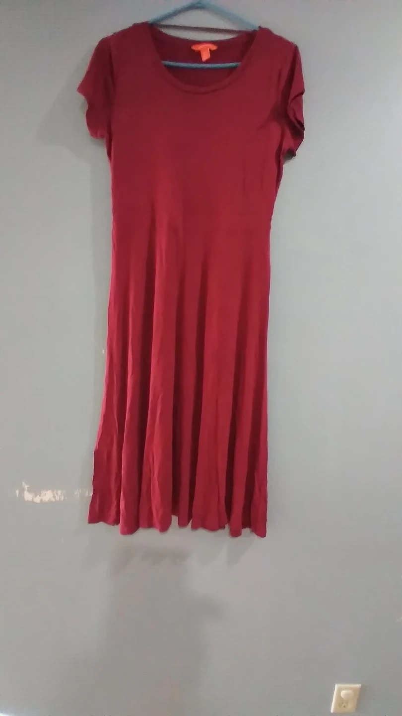A simple red midi dress with short sleeves and a flattering A-line skirt. It's made from a comfortable, stretchy fabric. This dress is perfect for casual outings or can be dressed up for a more formal occasion.