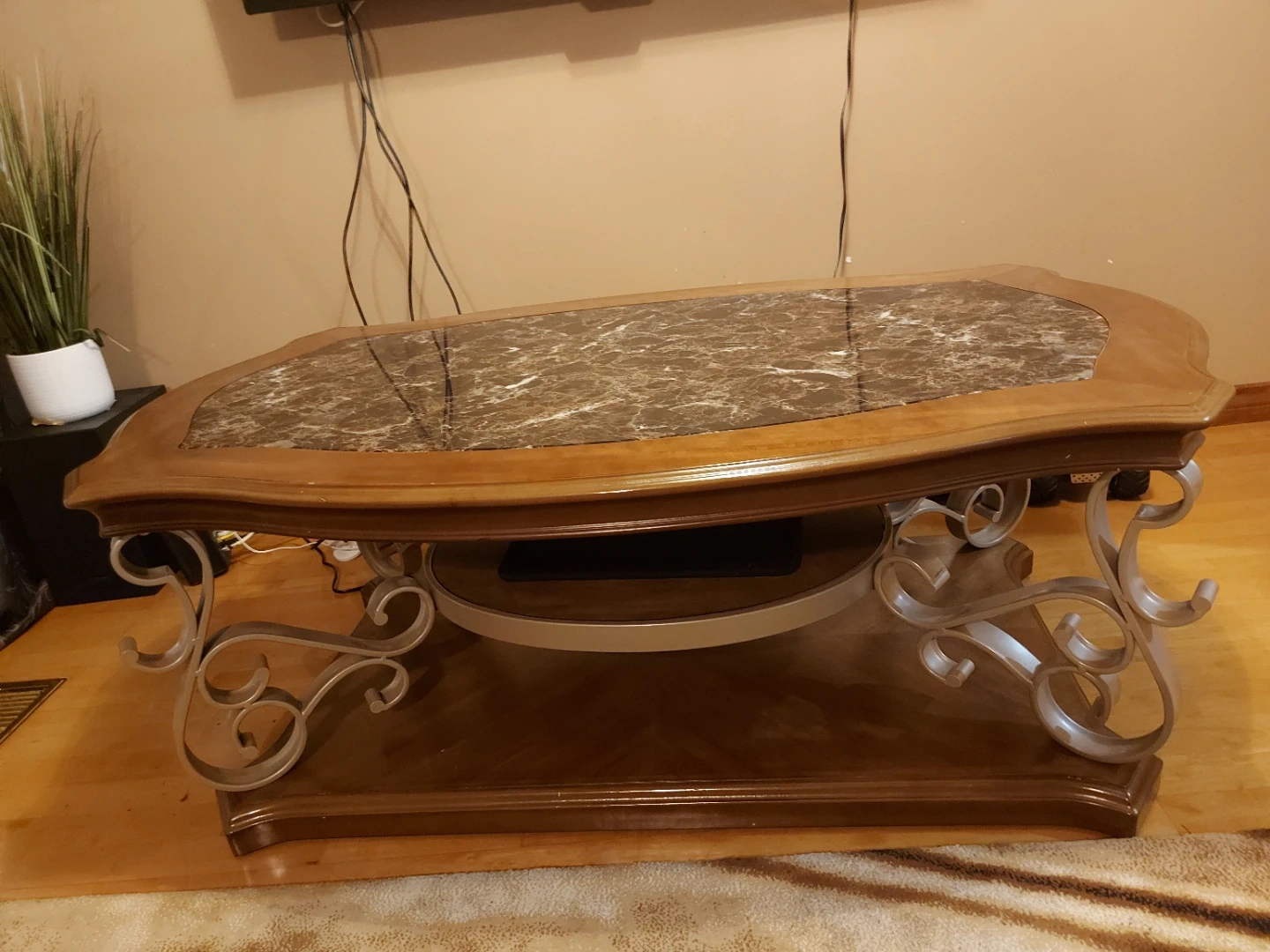 Wooden coffee table with a decorative marble-look top. It features ornate metal scrollwork on the legs and a lower shelf for storage. Measures approximately 48 inches long and 28 inches wide.