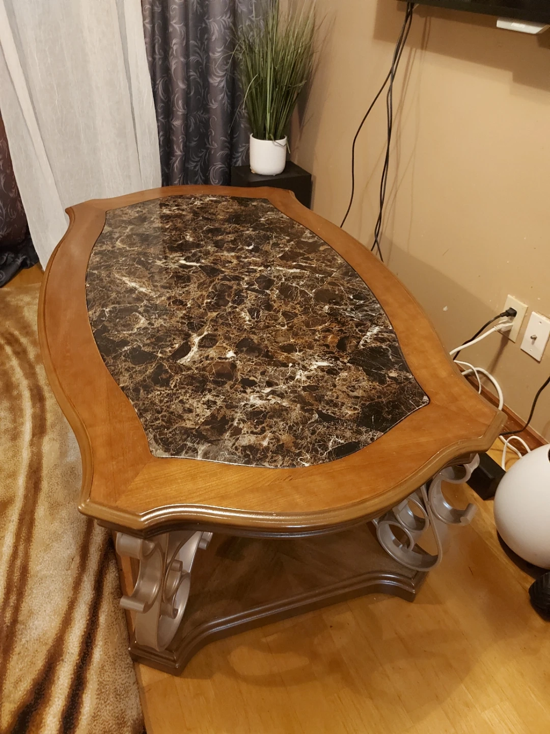 Wooden coffee table with a decorative marble-look top. It features ornate metal scrollwork on the legs and a lower shelf for storage. Measures approximately 48 inches long and 28 inches wide.