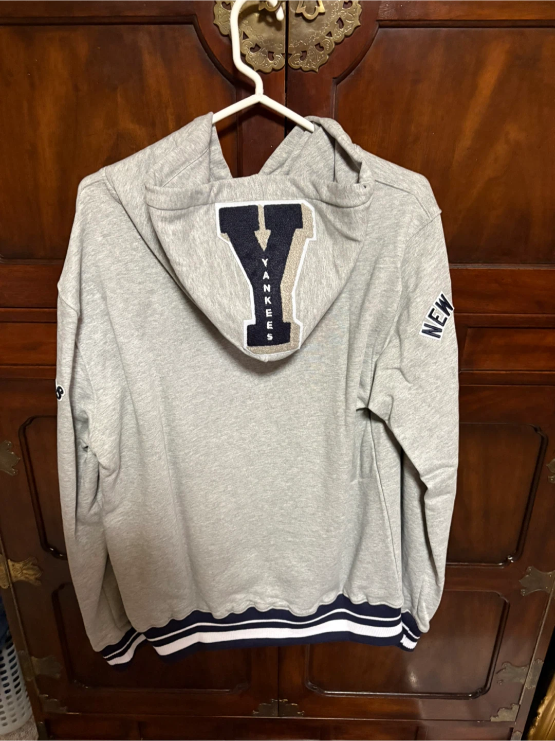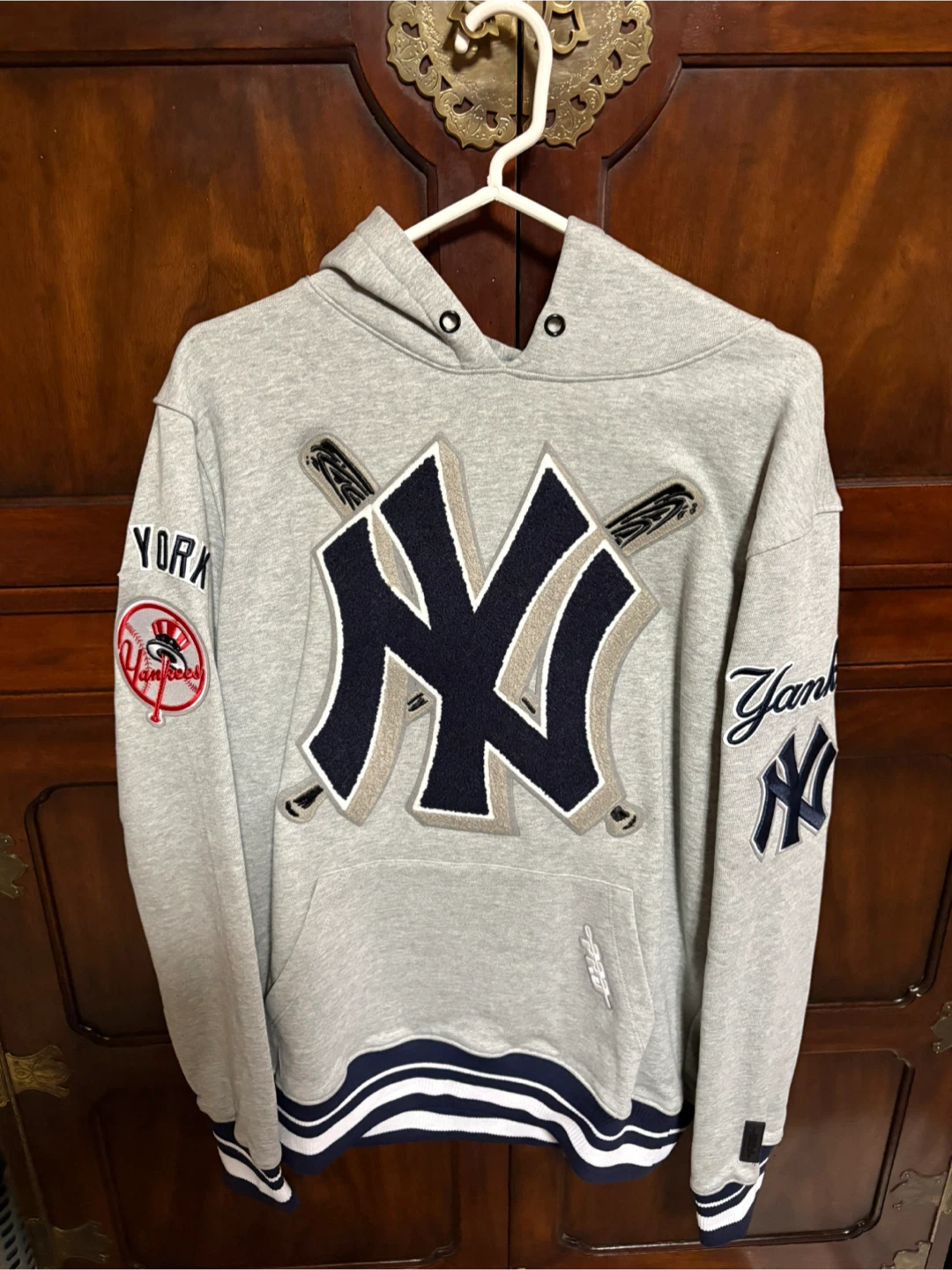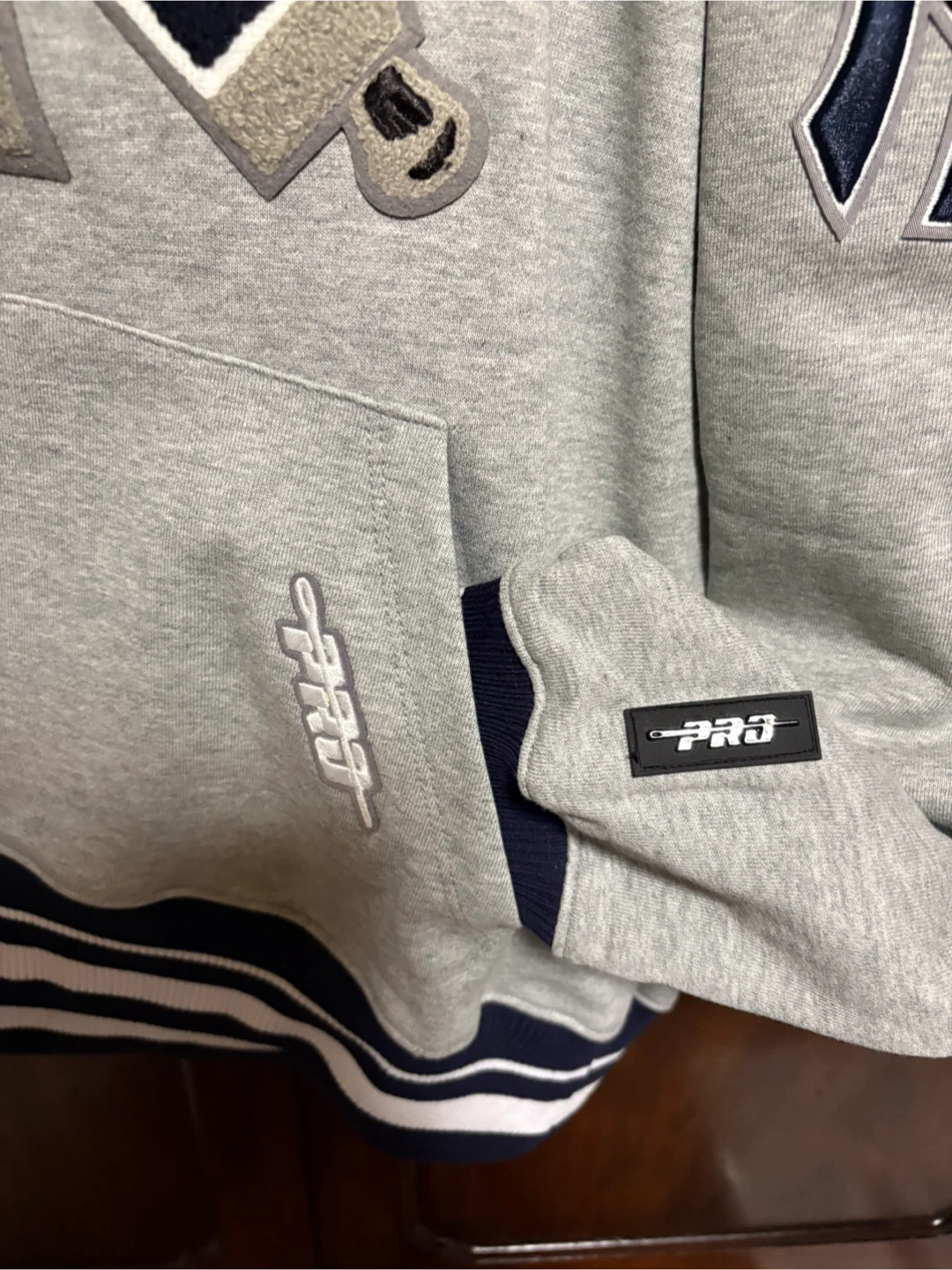 Selling a Pro Standard New York Yankees hoodie. It features the Yankees logo on the front and back, with additional logos on the sleeves. The hoodie is gray with navy and white accents. It's brand new, never worn!!!!