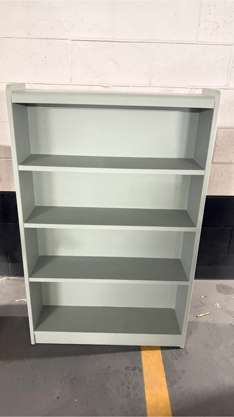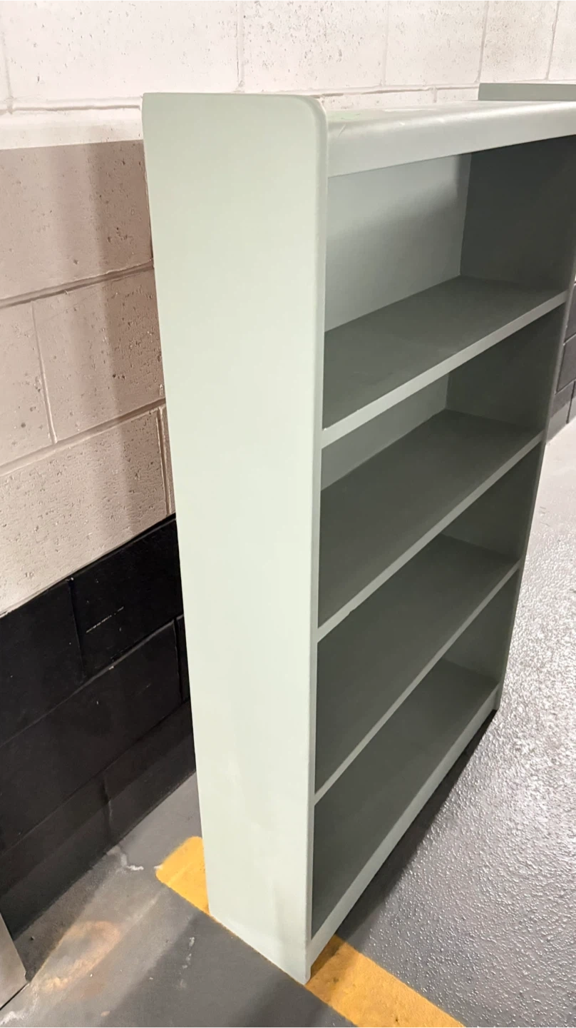 This is a four-shelf bookcase in a light green colour. The shelves are evenly spaced and offer ample storage. It's a simple design, suitable for organizing books or display items. This unit would be useful for a home office or living space.