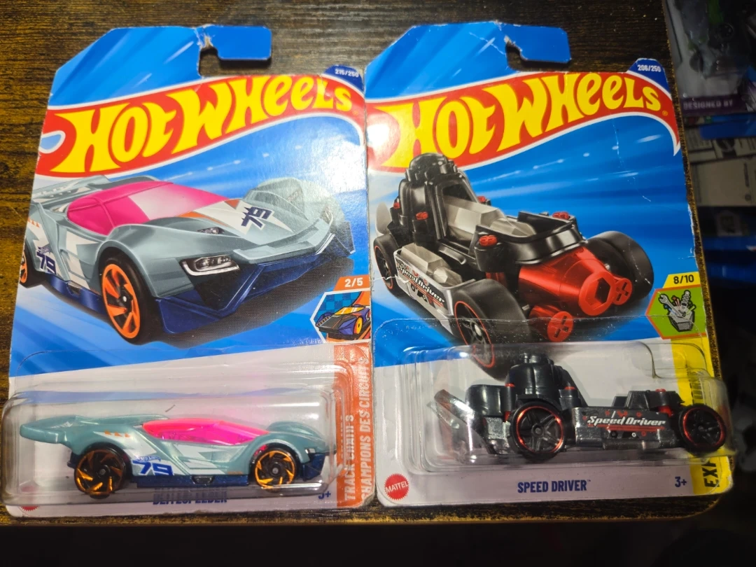 Four assorted Hot Wheels toy cars in their original packaging. Includes 'RD-08', 'Speed Driver', and two others. Recommended for ages 3 and up. Great for collectors or playtime!