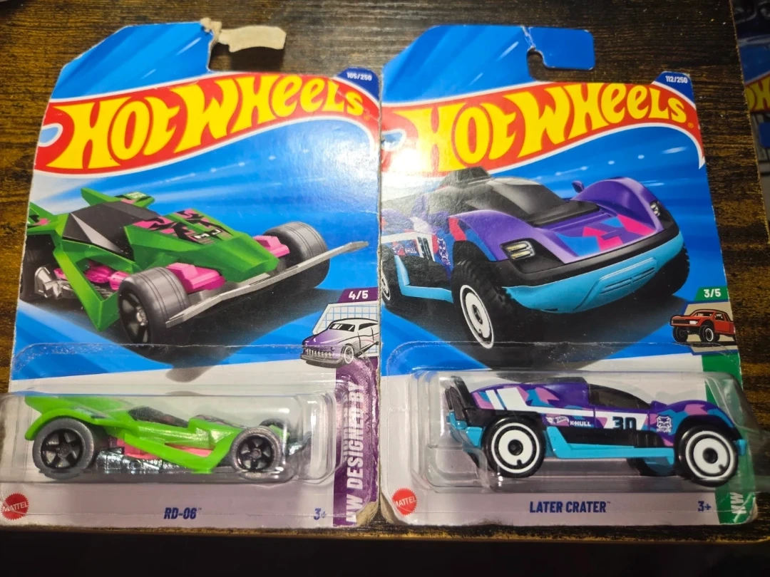 Four assorted Hot Wheels toy cars in their original packaging. Includes 'RD-08', 'Speed Driver', and two others. Recommended for ages 3 and up. Great for collectors or playtime!