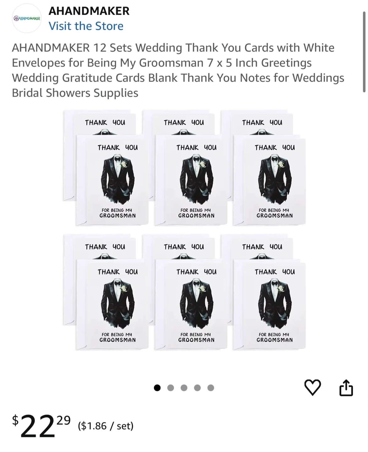 Buy & SellWedding Thank You Cards-Groomsmen (6pcs)Wedding Thank You Cards-Groomsmen (6pcs)$8‘Thank You For Being My Groomsman' cards with envelopes. Have 6 left. Perfection condition!ConditionNewWHERE TO MEETBanknote Bar CorktownView MapSELLERverifiedIloWaterfront Communities22813 reviews0 chats·0 favorites·29 viewsSEND CHAT TO SELLERHi Ilo! I’m interested in your listing.Hi Ilo! I’m interested in your listing.Get the Karrot app to chatSign In to chat