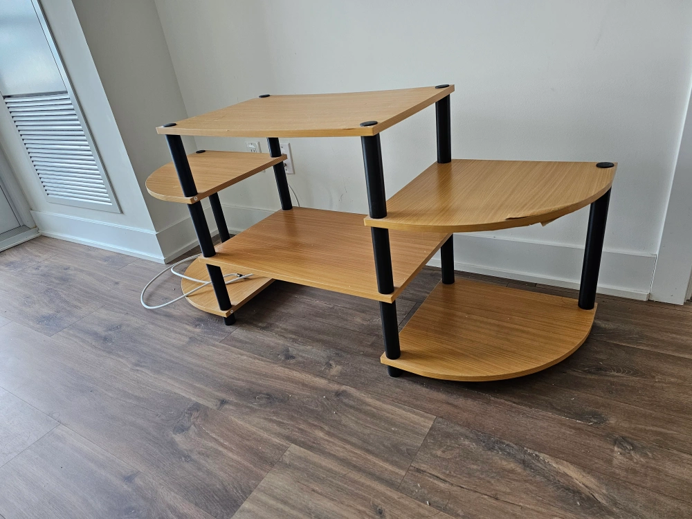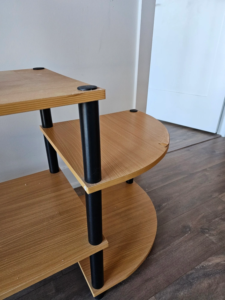 Used TV stand. Three shelves, curved sides. Some minor damage (see photo #3). Good for small electronics and media storage.