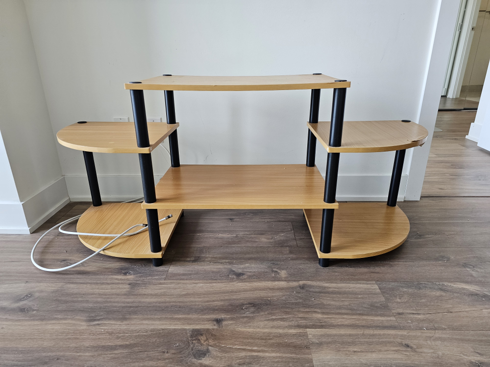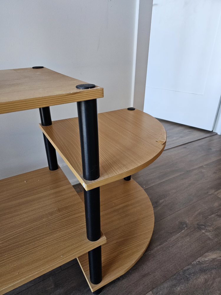 Used TV stand. Three shelves, curved sides. Some minor damage (see photo #3). Good for small electronics and media storage.
