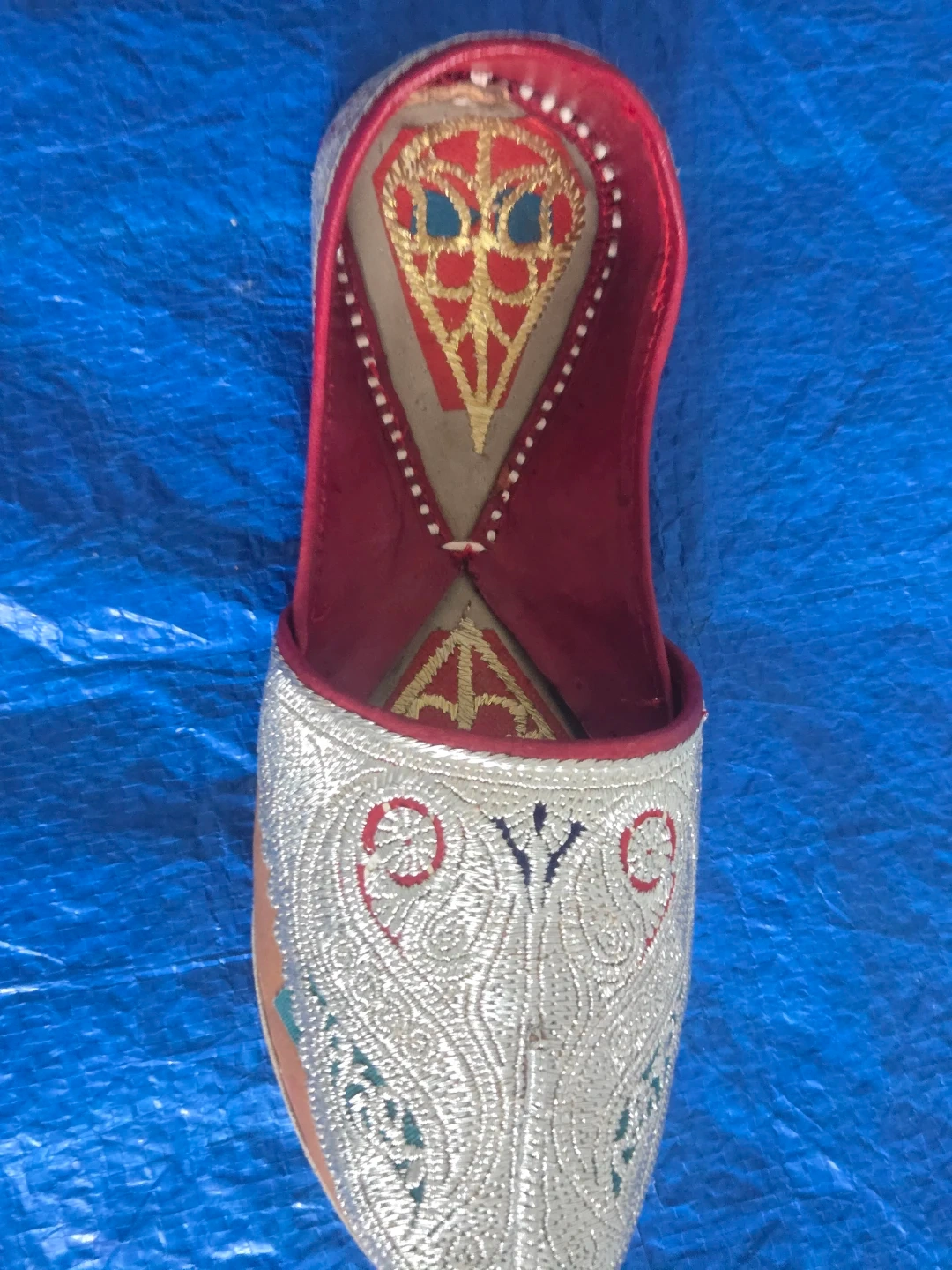 These are traditional Indian jutti shoes with intricate silver embroidery. They feature a comfortable leather sole and a vibrant red interior lining. Perfect for cultural events or adding a unique touch to an outfit!