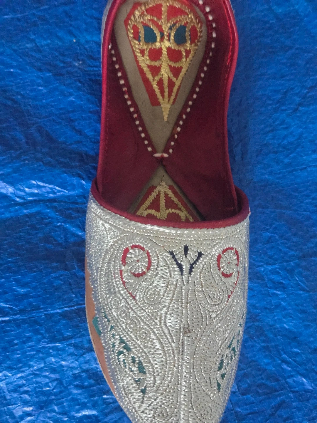 These are traditional Indian jutti shoes with intricate silver embroidery. They feature a comfortable leather sole and a vibrant red interior lining. Perfect for cultural events or adding a unique touch to an outfit!