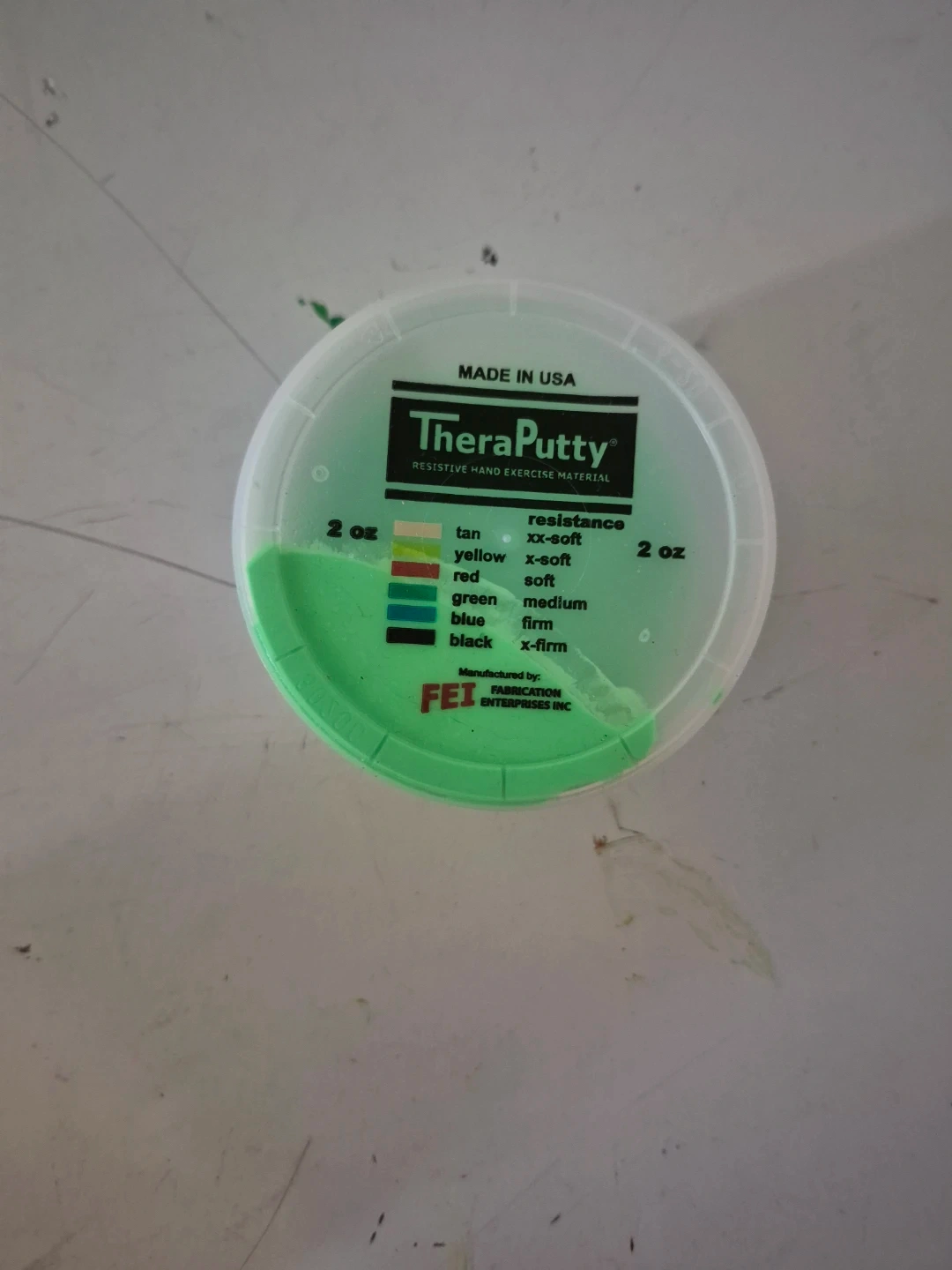 This is a 2 oz container of TheraPutty, a resistive hand exercise material. The putty is green, indicating a medium resistance level. It's made in the USA. This is useful for hand therapy and strengthening exercises.