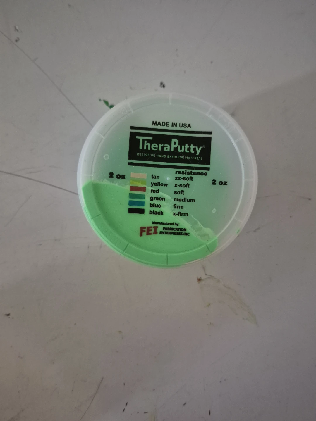 This is a 2 oz container of TheraPutty, a resistive hand exercise material. The putty is green, indicating a medium resistance level. It's made in the USA. This is useful for hand therapy and strengthening exercises.