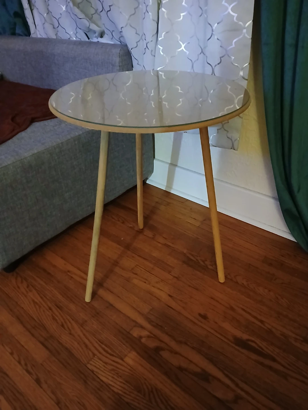 A small side table with a round removable glass top and a light wood base. It has three tapered legs.