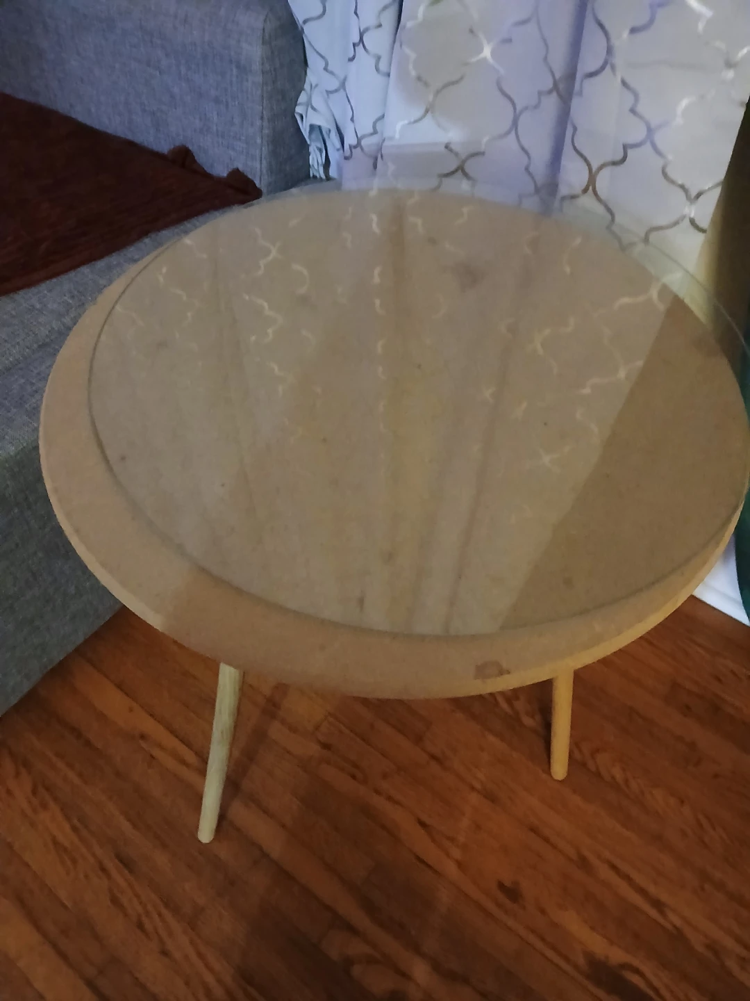 A small side table with a round removable glass top and a light wood base. It has three tapered legs.