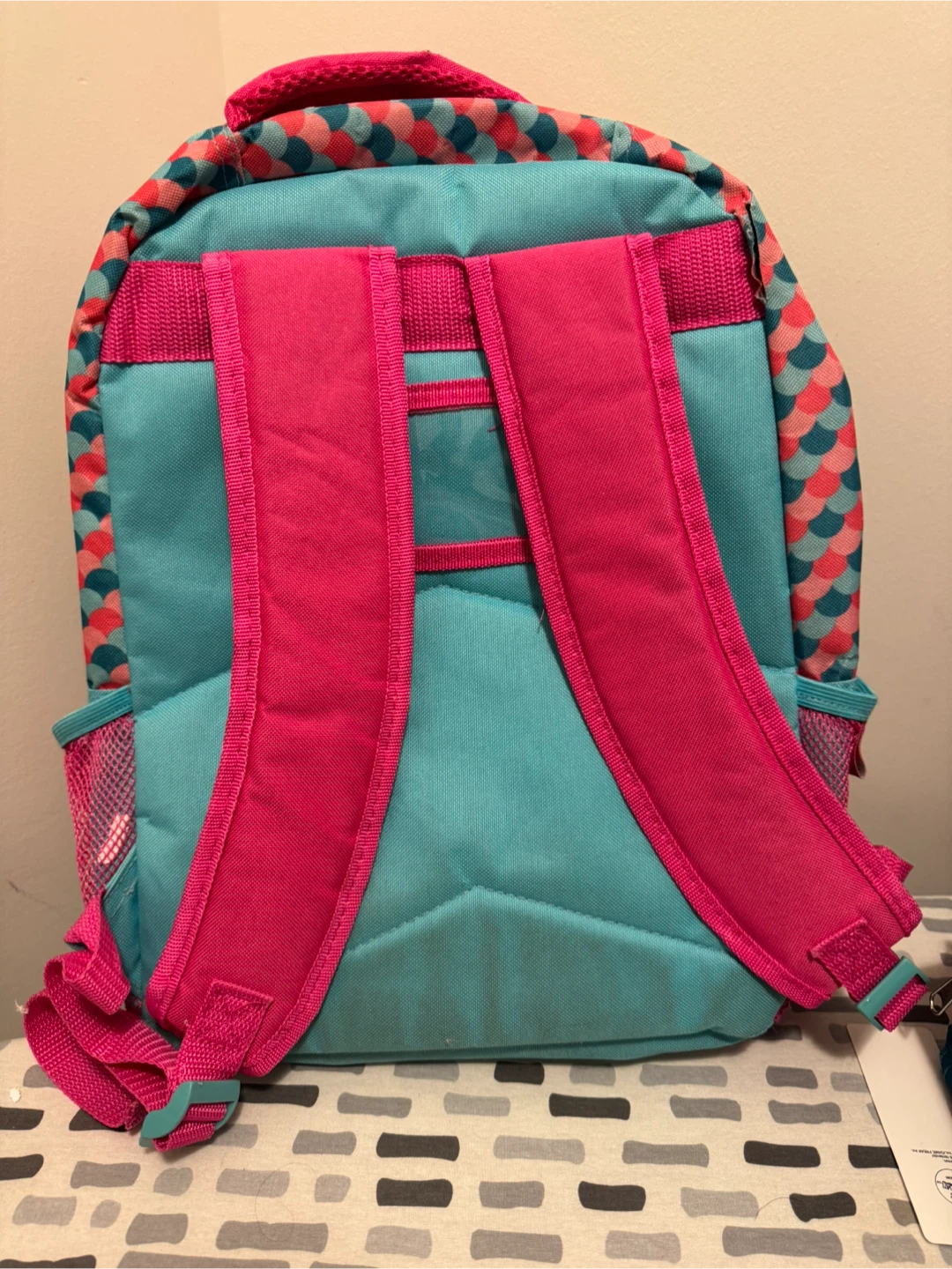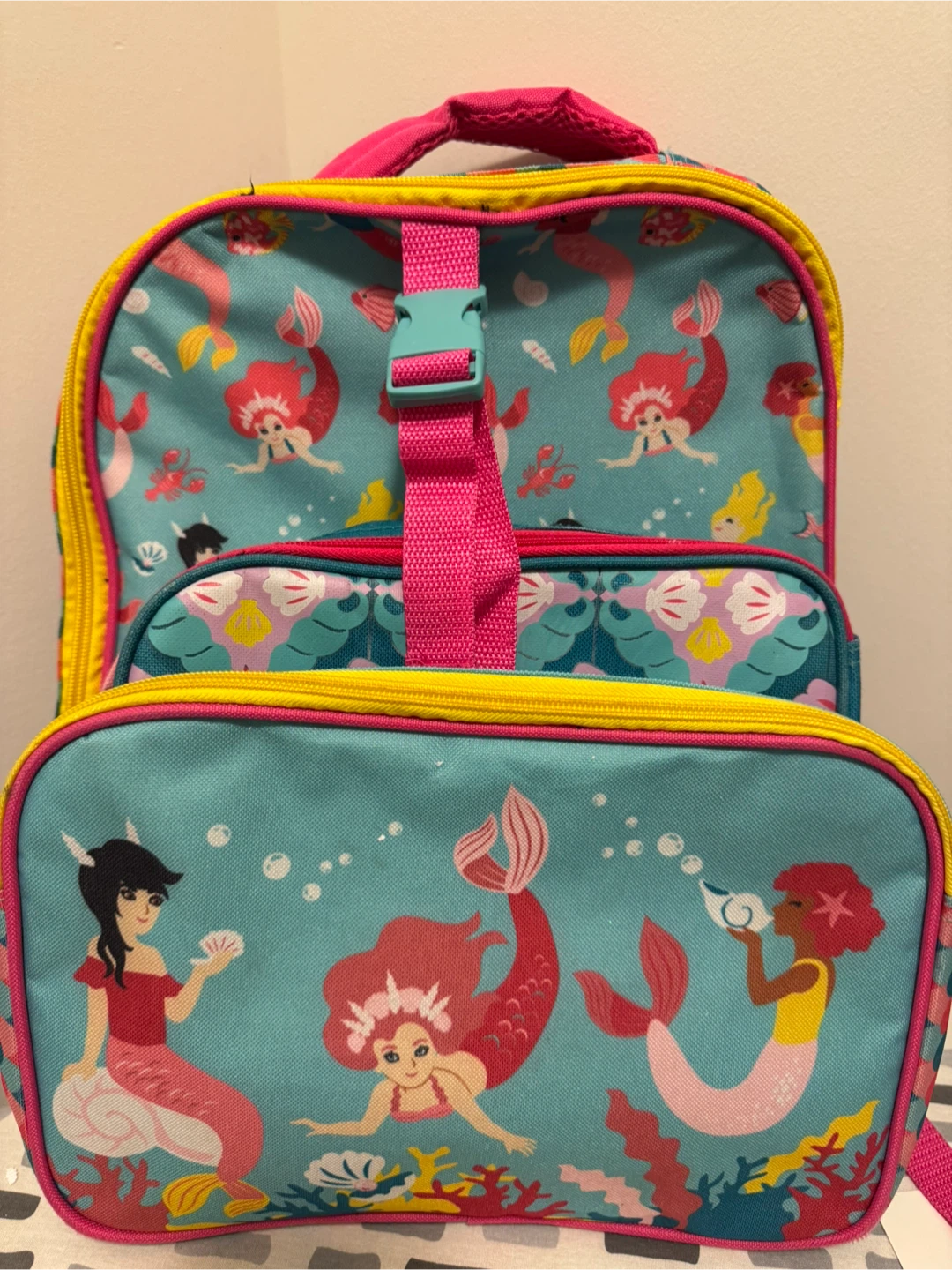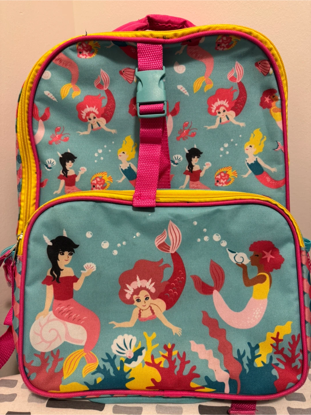 Free mermaid backpack featuring a vibrant design with mermaids and sea creatures on a turquoise background.