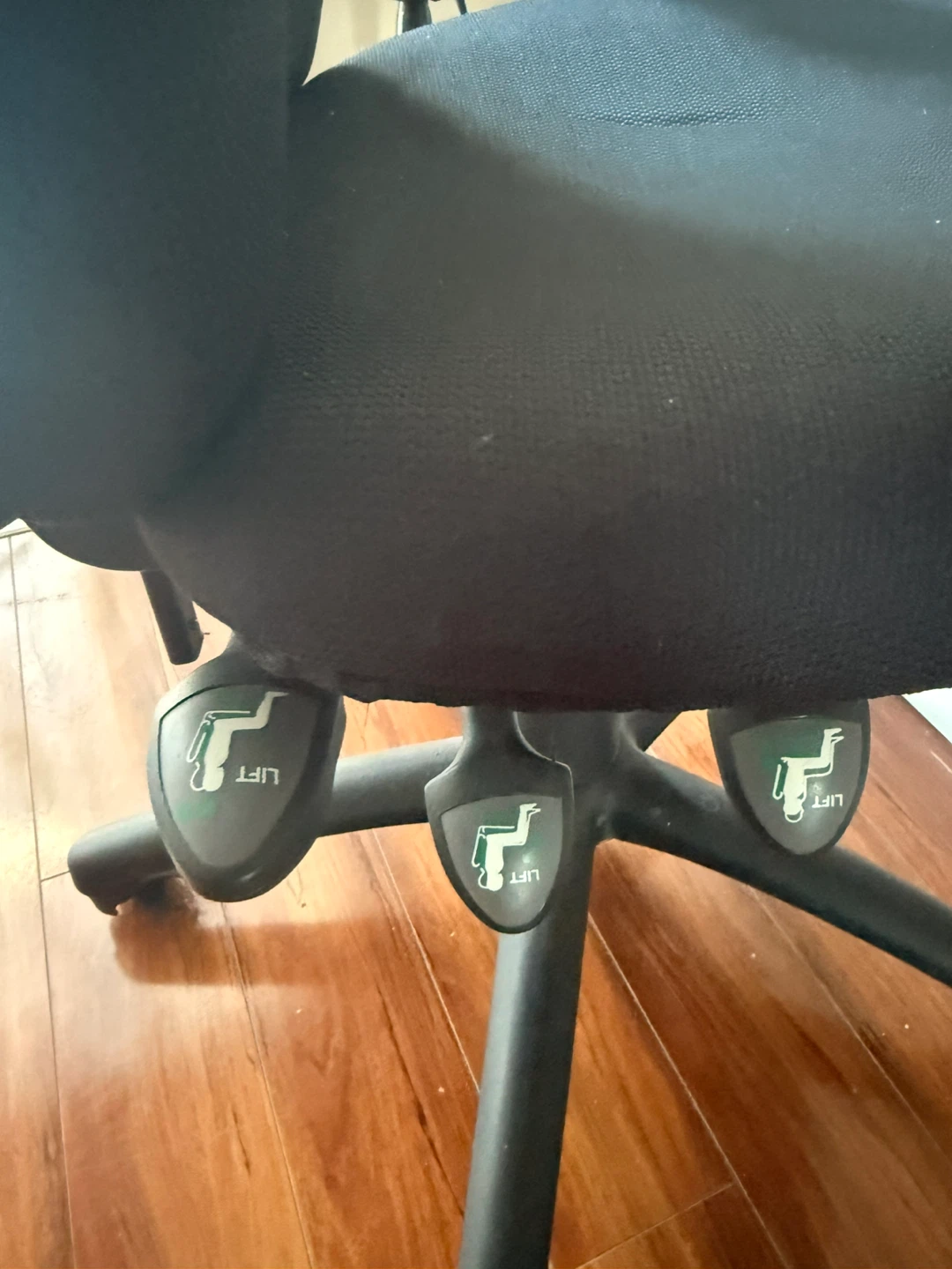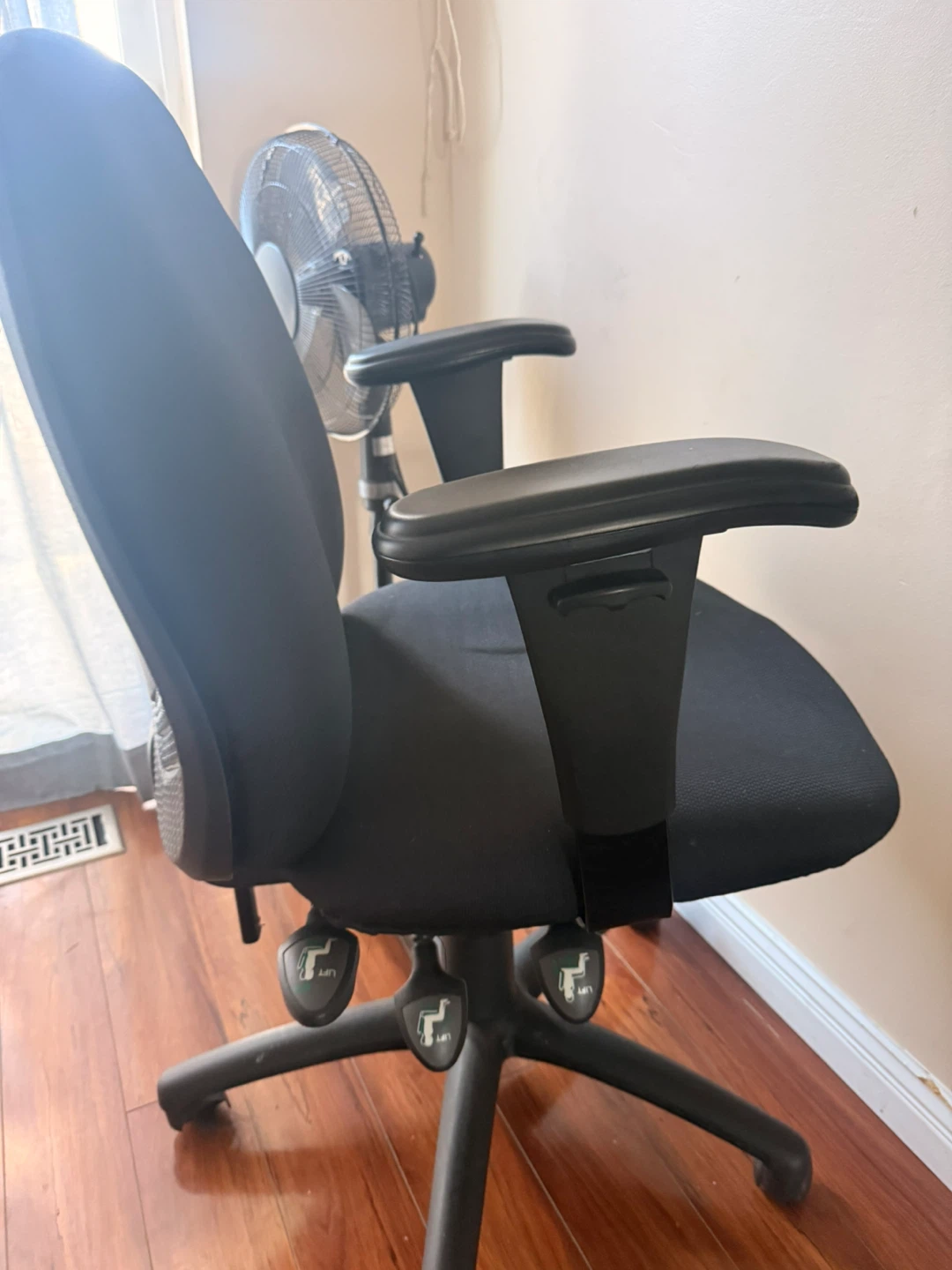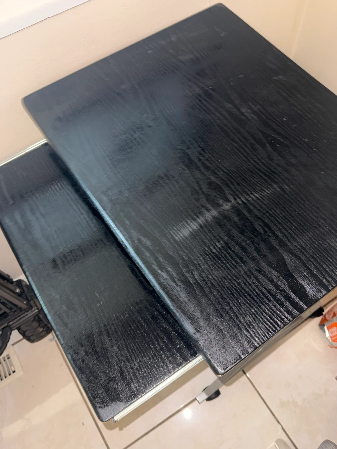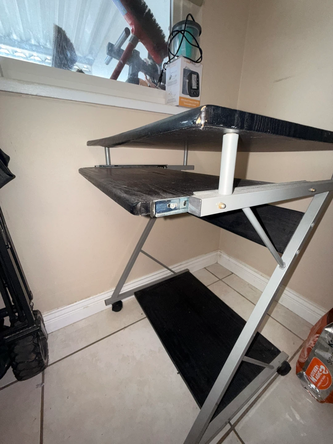 Compact black 2-tier work desk. Has a cool sliding top shelf, great for keyboard or just extra space. Metal frame is sturdy. Rolling chair to go with the desk. Good for a small spot or home office setup.