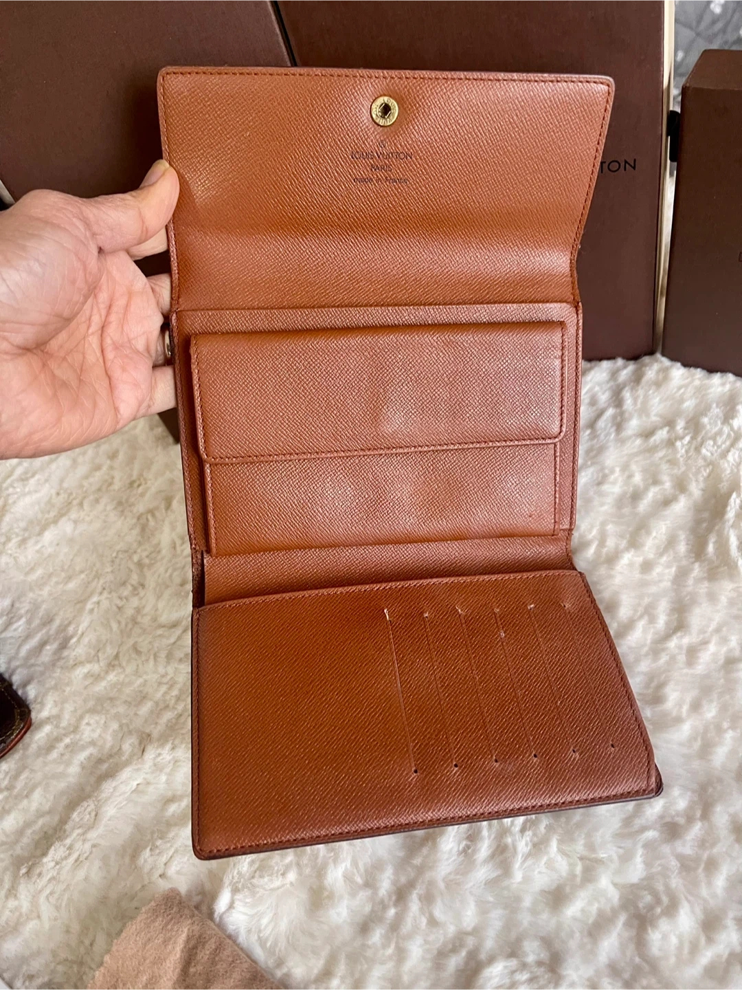 Louis Vuitton bifold wallet in classic monogram canvas. Interior features multiple card slots and compartments. Made in France.