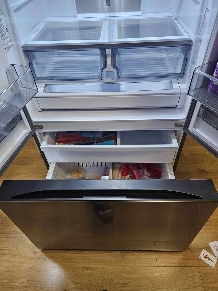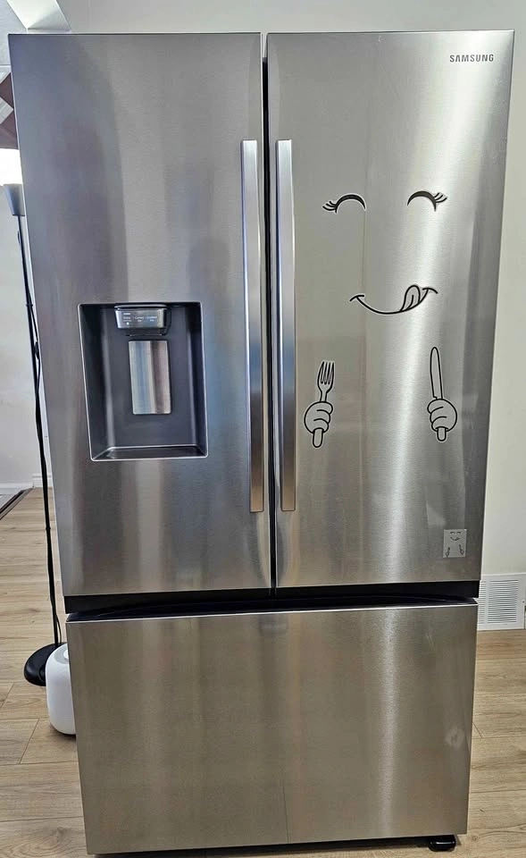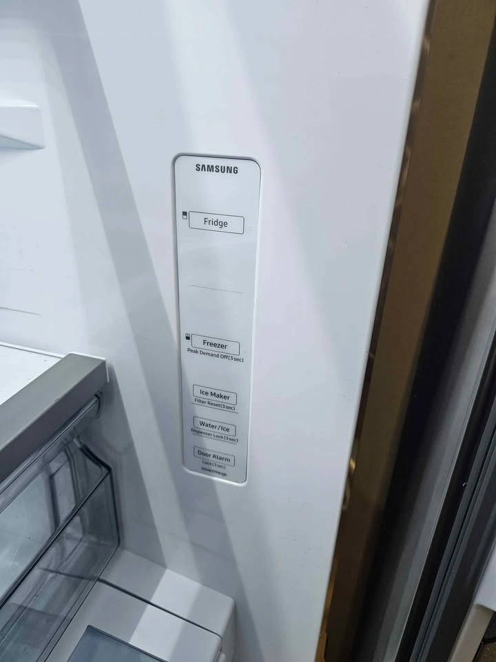 Selling a clean Samsung 36-inch wide, 3-door French Door refrigerator in Fingerprint Resistant Stainless Steel. It has a 31 cu. ft. Mega Capacity, perfect for large items. Features include a Dual Auto Ice Maker (cubed & Ice Bites™) and an external dispenser (curved & crushed). Cooling is consistent with All-Around Cooling & Metal Cooling. It's Wi-Fi enabled with SmartThings Energy, Power Cool/Freeze, and a Door Alarm. Convenience features: external filtered water/ice dispenser, adjustable slide-in shelf, LED lighting, and Gallon Door Bins. It's ENERGY STAR Certified. The panel is not working and shows a C6 error, but the fridge and freezer function perfectly otherwise. Pickup only.