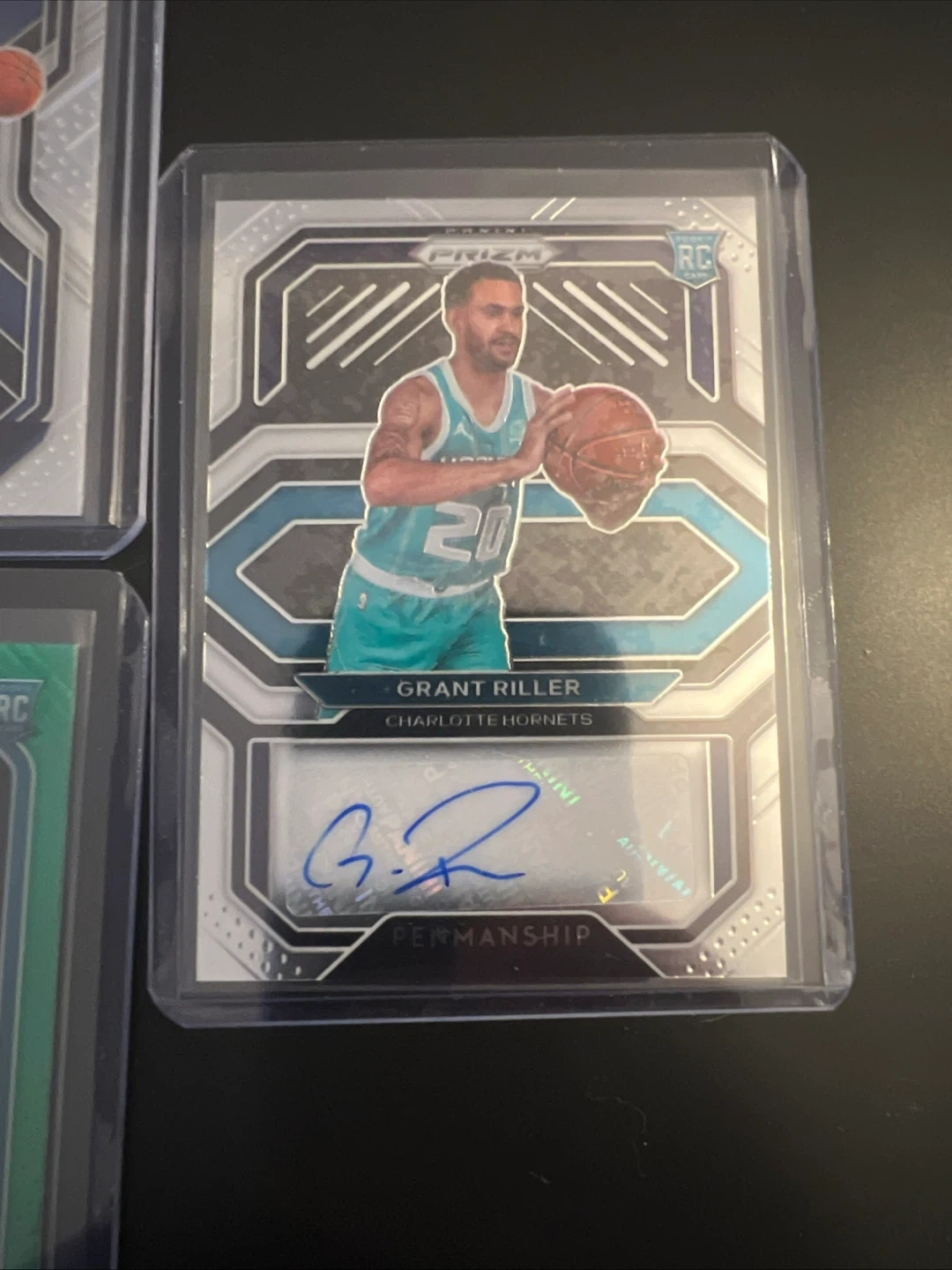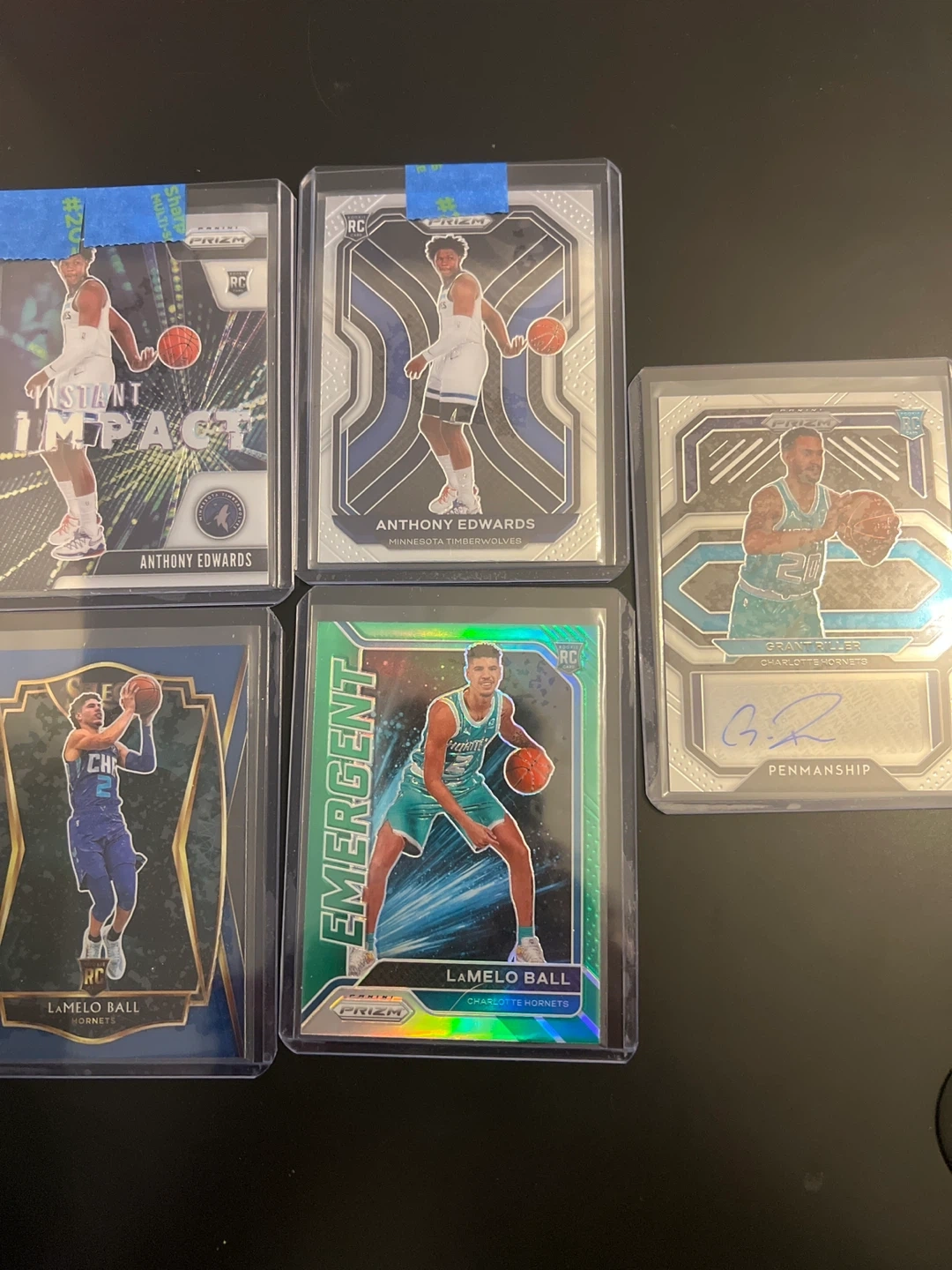 Collection of Panini Prizm NBA trading cards featuring rookie players. Includes Grant Riller with autograph, Anthony Edwards, and LaMelo Ball. Great for basketball card collectors!