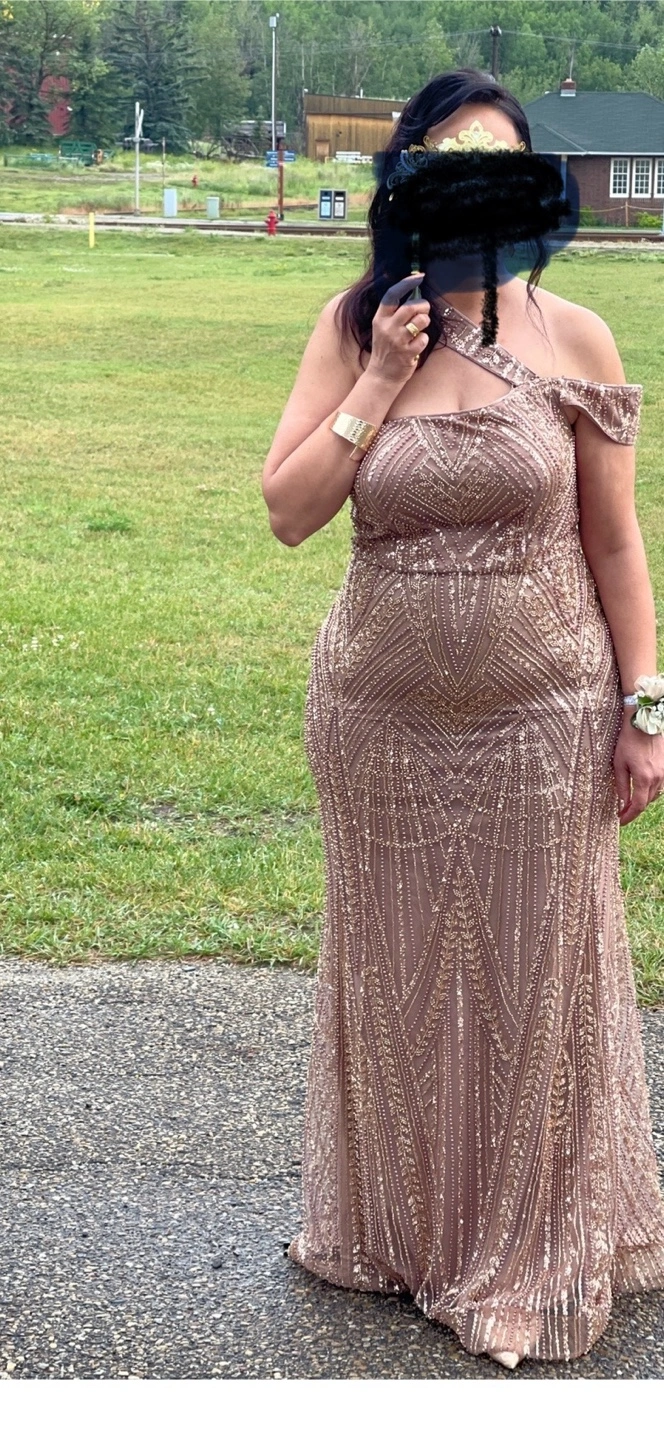 Beautiful formal gown with sequin embellishments! Perfect for a special occasion. The dress has a unique one-shoulder design and a flattering silhouette.