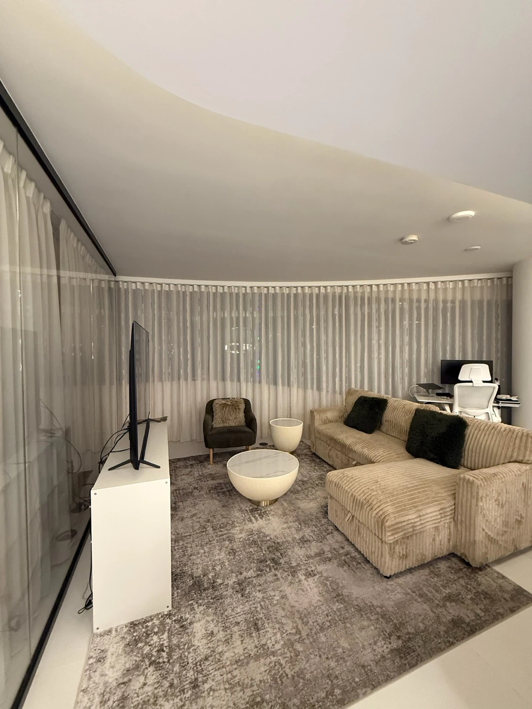 Cozy beige corduroy sectional sofa with a chaise. Plush, comfortable cushions. It's perfect for relaxing in your living room. Sofa has a ribbed texture.