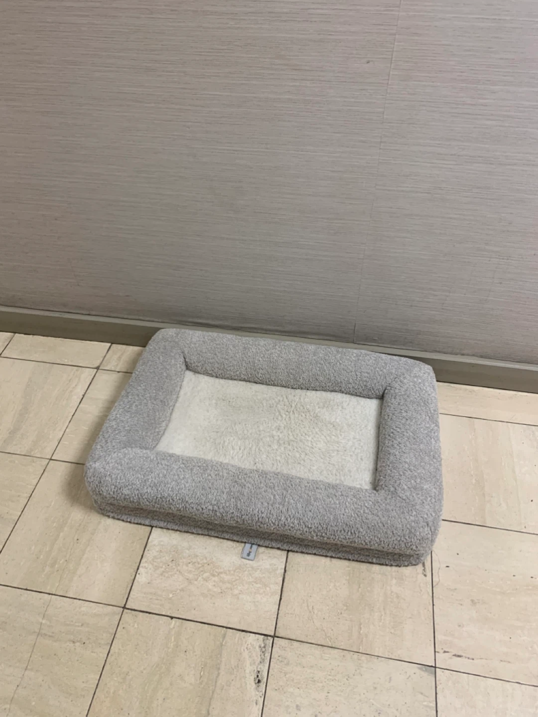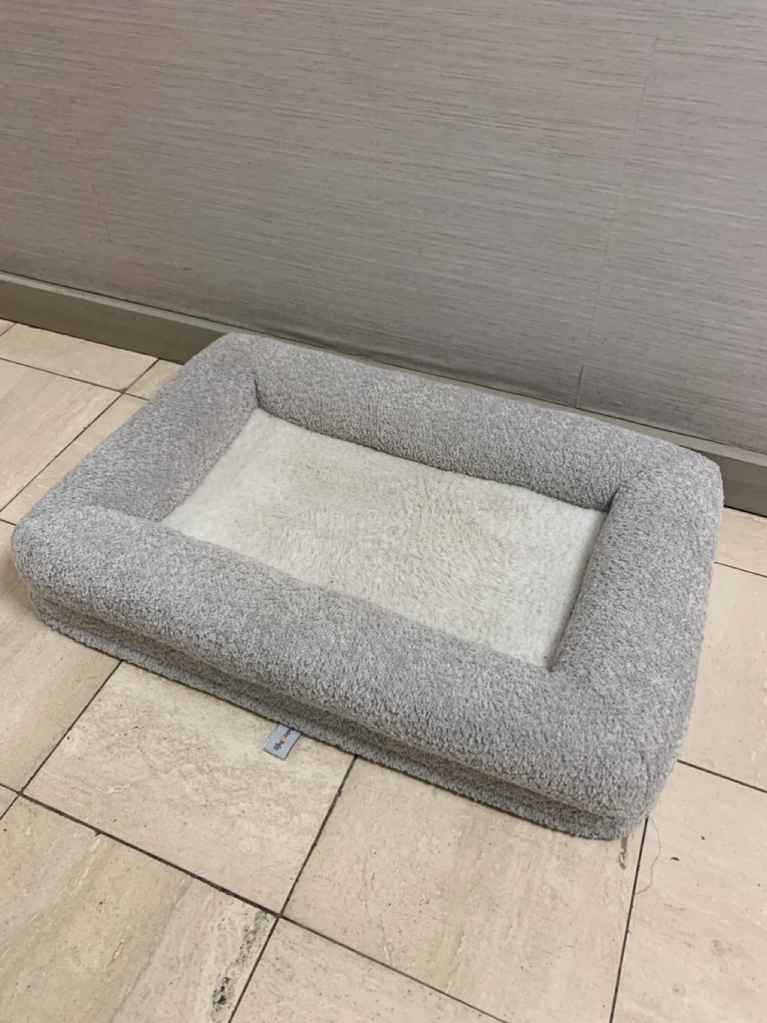 Soft grey pet bed with a fluffy white interior. Great for small to medium-sized pets. Provides a cozy spot for your furry friend to rest!