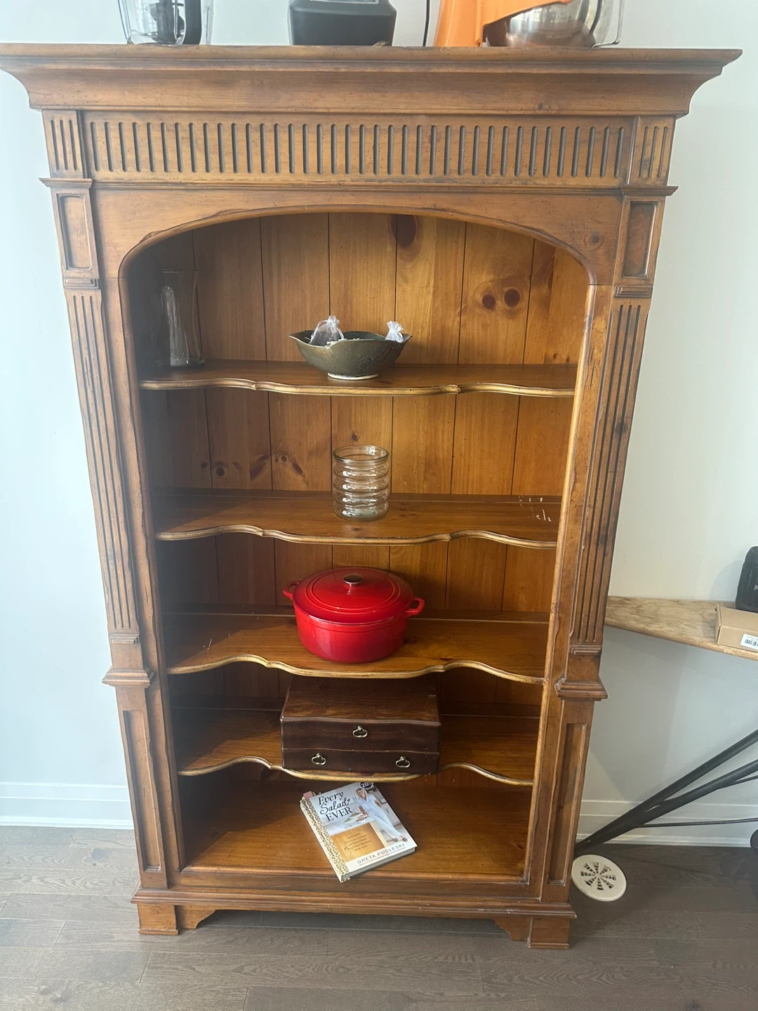 Wooden bookcase with an arched top and decorative fluting. It has multiple shelves, perfect for storing books or display items. Some minor scuffs are present on one interior shelf. Curved front on shelves.