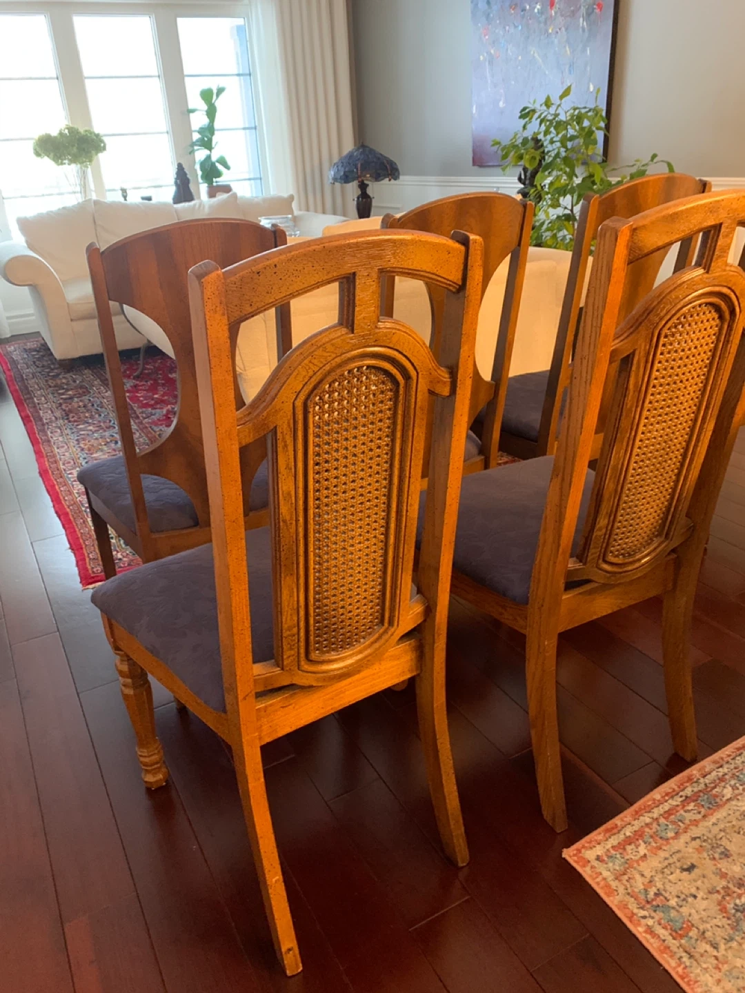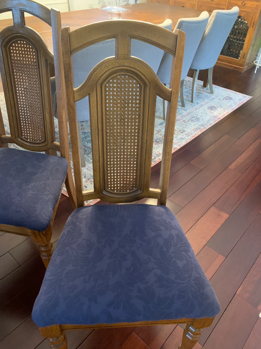 Set of 6 dining chairs with sturdy wood frames and upholstered seats. The dark blue fabric has a subtle pattern. These chairs are ready for your dining room! $25 each .