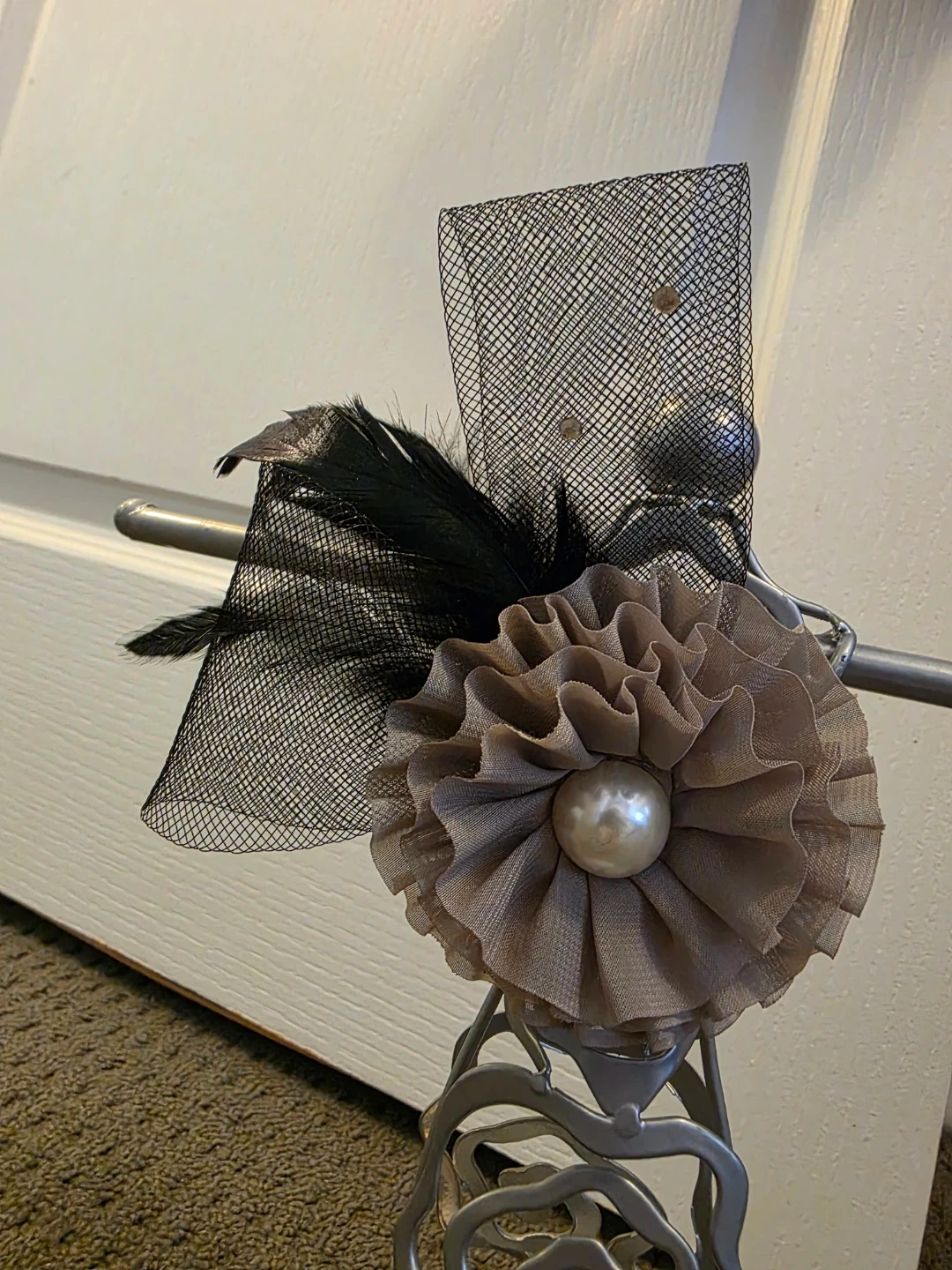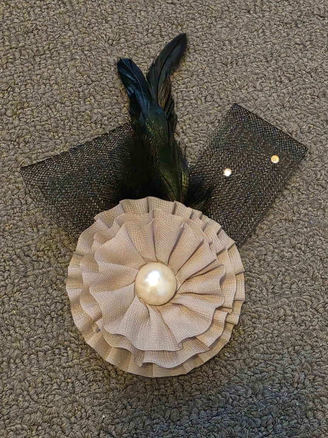 This brooch/hair clip features a fabric flower embellishment with black feathers and faux pearls. It has a secure clip and pin backing. It's a stylish accessory for hats, clothing, or hair.