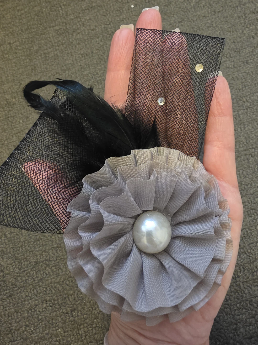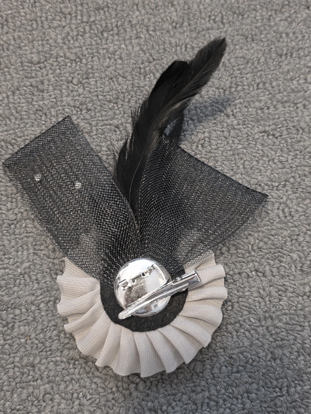This brooch/hair clip features a fabric flower embellishment with black feathers and faux pearls. It has a secure clip and pin backing. It's a stylish accessory for hats, clothing, or hair.