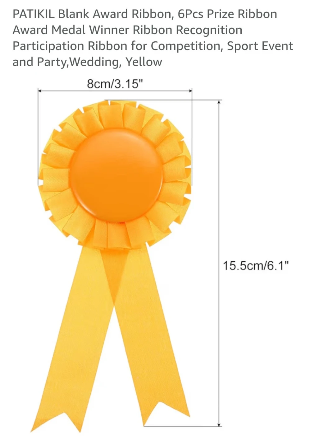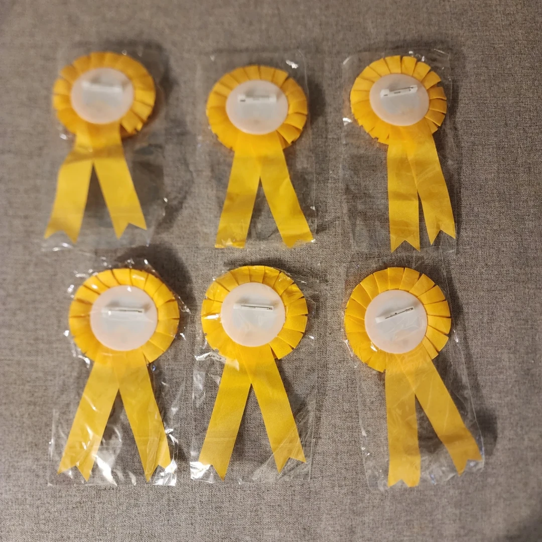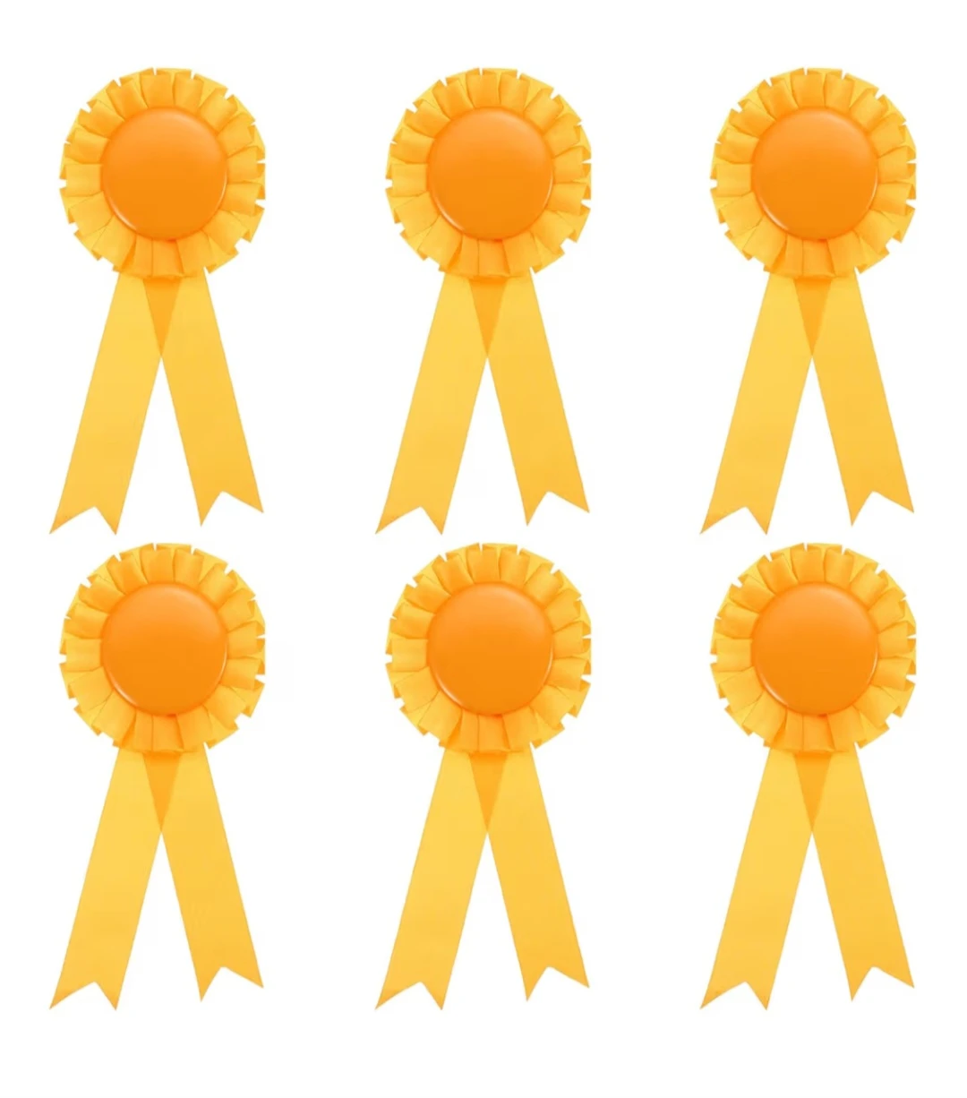 Set of six yellow blank award ribbons. Each ribbon measures 15.5cm long and 8cm wide. Features a pin backing for easy attachment. Perfect for awarding achievements or participation!