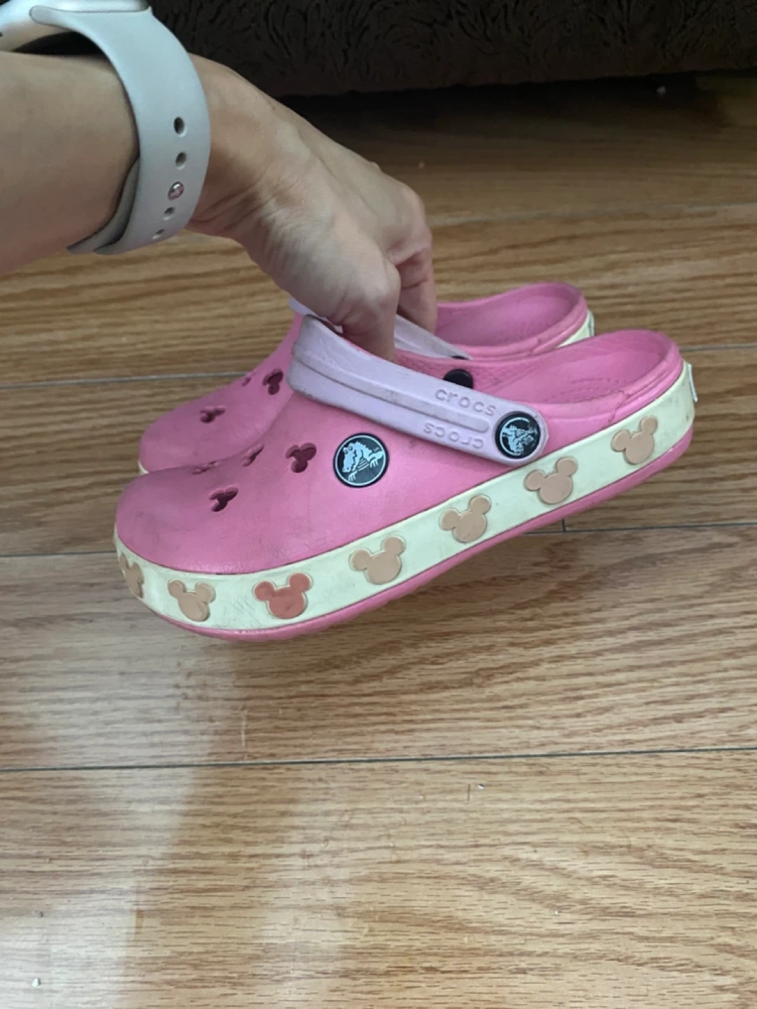 Selling a pair of Crocs kids clogs in pink. They have a cute Mickey Mouse design around the sole. Size 10.