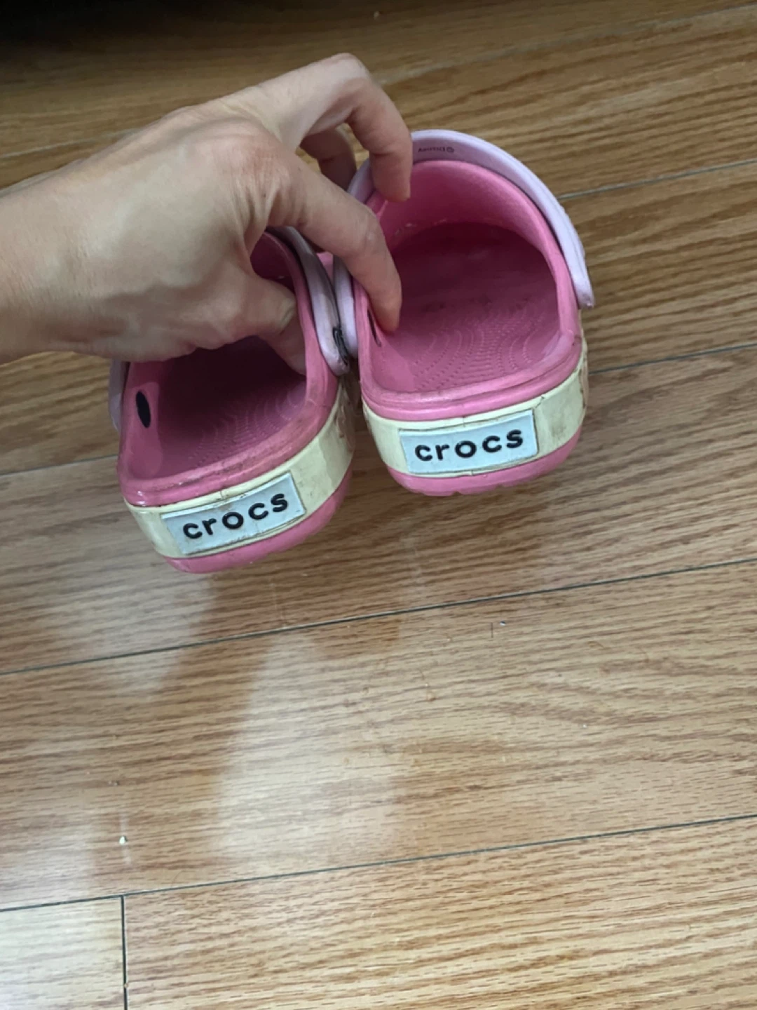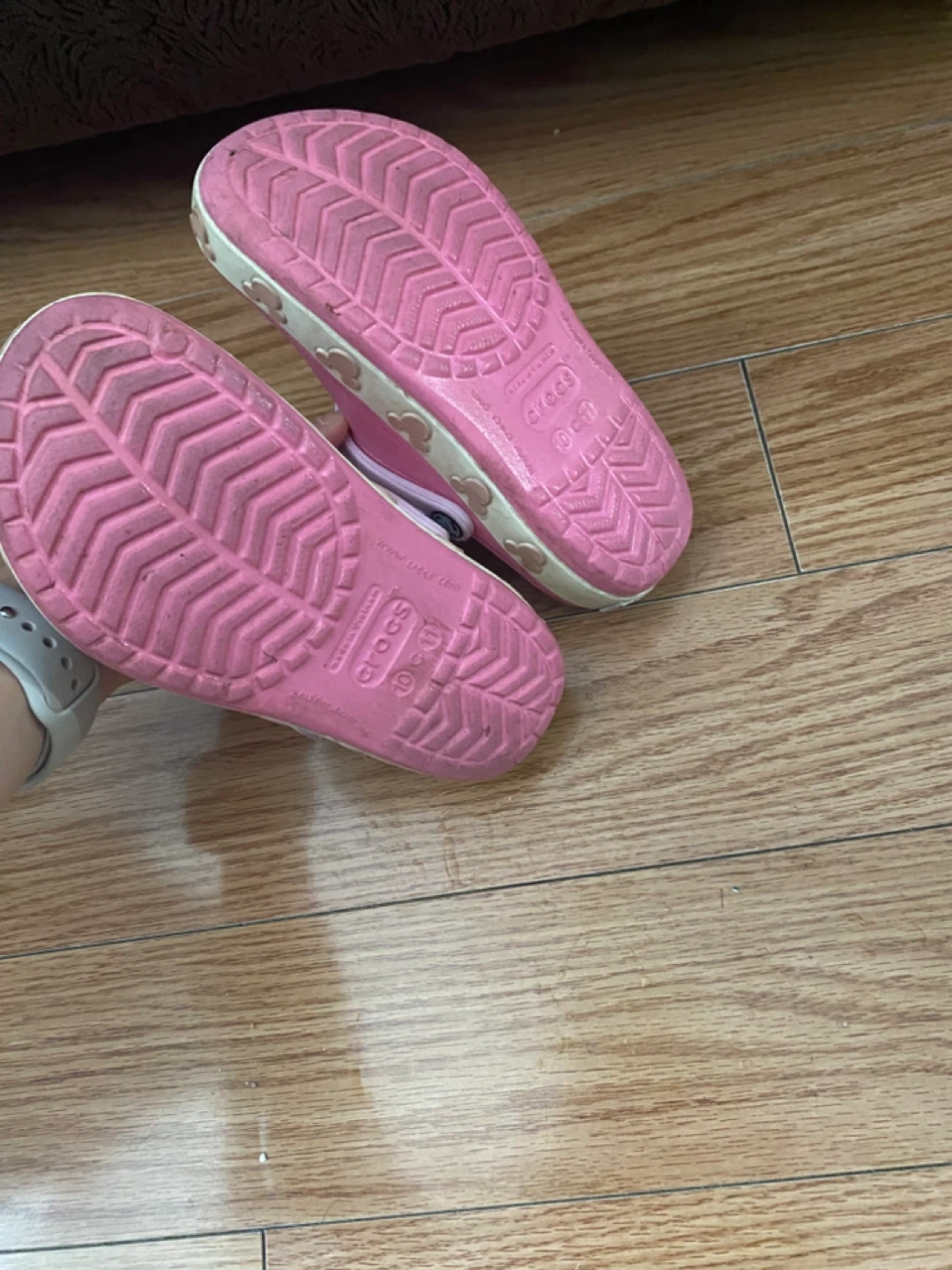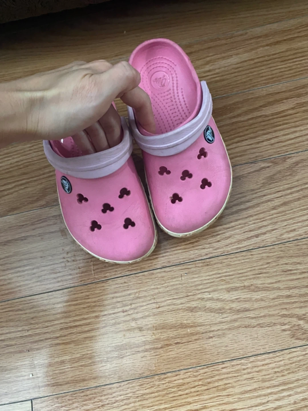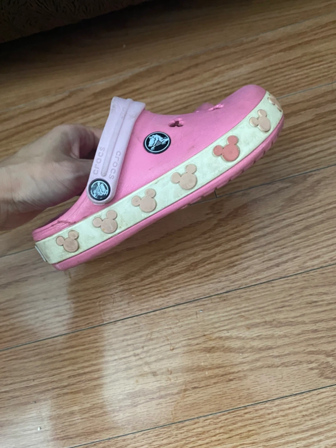 Selling a pair of Crocs kids clogs in pink. They have a cute Mickey Mouse design around the sole. Size 10.