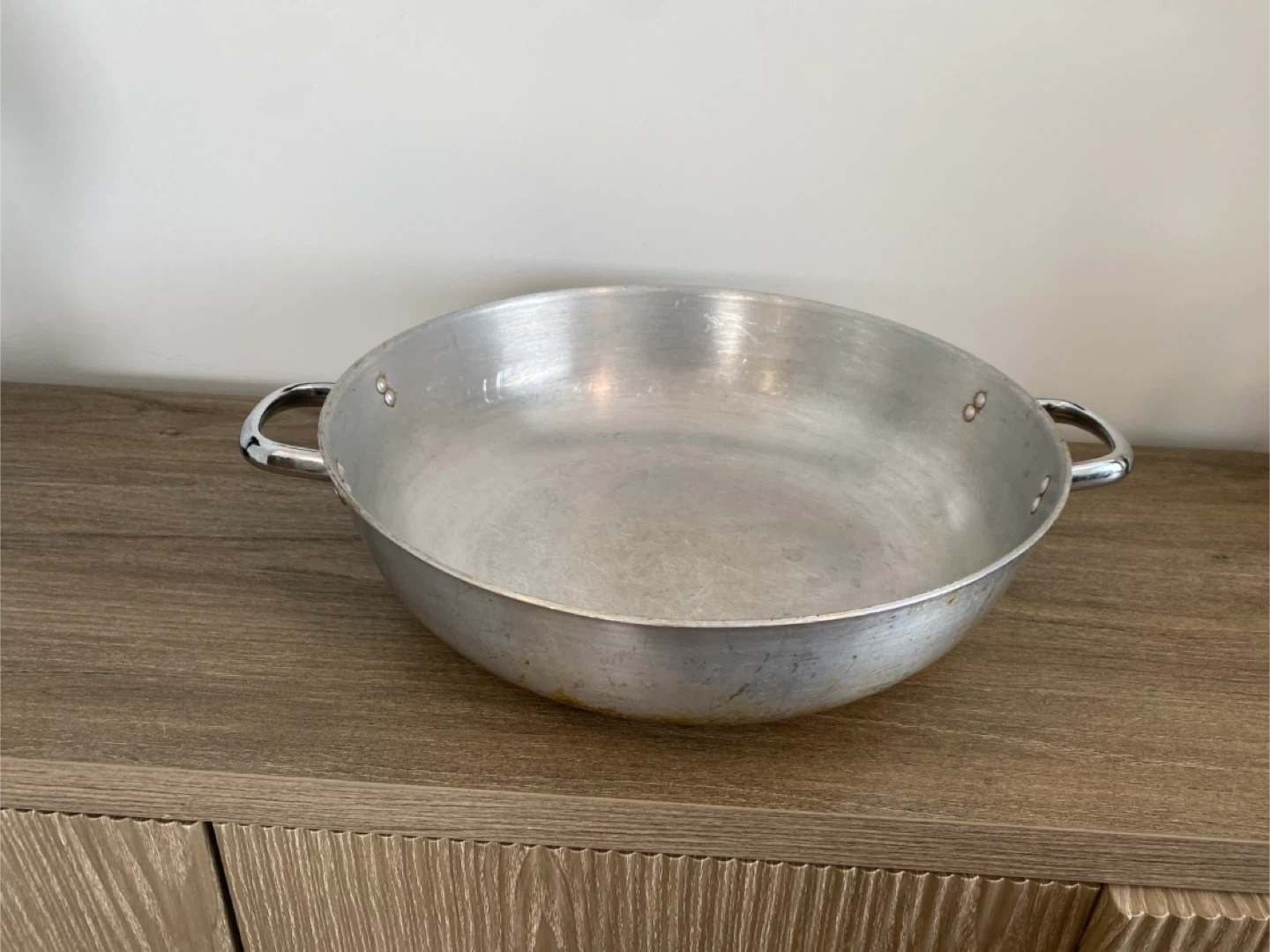 This is a large, durable and deep aluminum pot. It has two sturdy handles for easy carrying. Perfect for family dinners or holiday feasts!