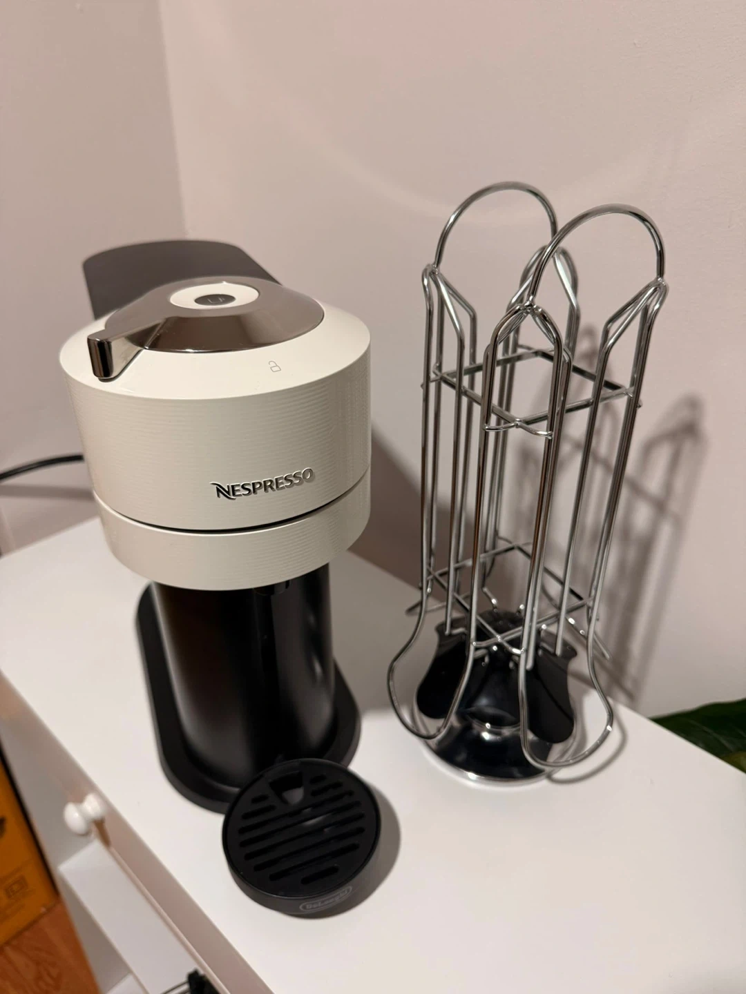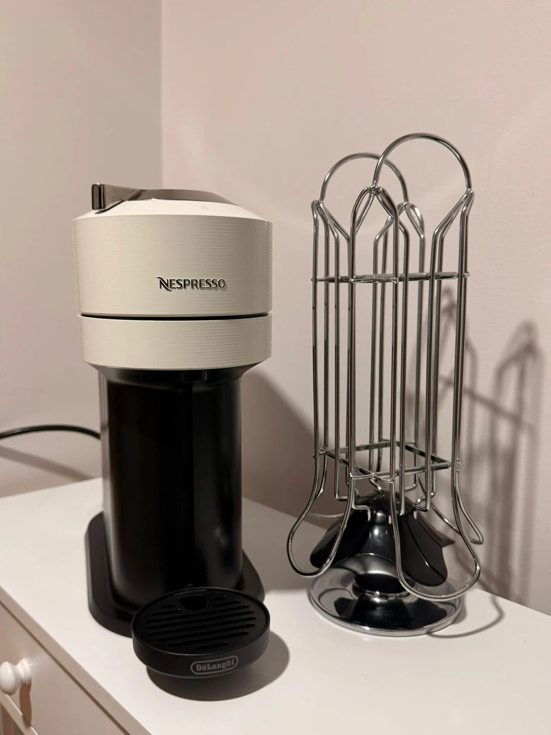 This Nespresso Vertuo machine brews coffee in 7 cup sizes. It features a simple one-touch button operation. It’s in perfect condition (like new) no scratches, super clean because I used it like 3 times. I’ll give you the capsule holder as I gift