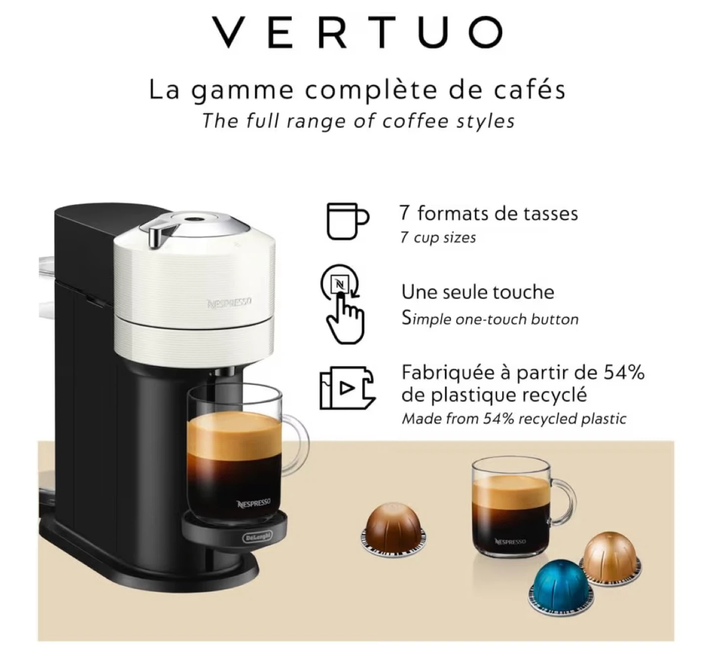 This Nespresso Vertuo machine brews coffee in 7 cup sizes. It features a simple one-touch button operation. It’s in perfect condition (like new) no scratches, super clean because I used it like 3 times. I’ll give you the capsule holder as I gift