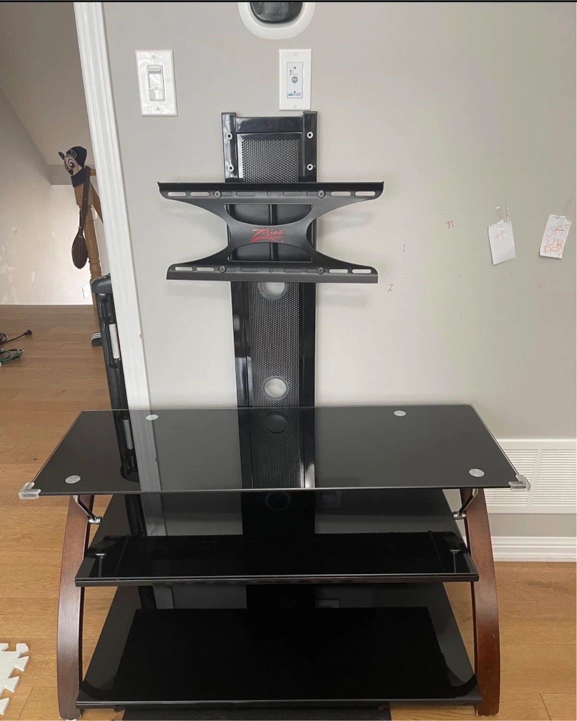 63Selling a Z-Line Designs TV stand with a built-in mount. It's in great shape and ready to hold your TV and media components. The stand features a sleek design with black glass shelves and a dark wood finish.
