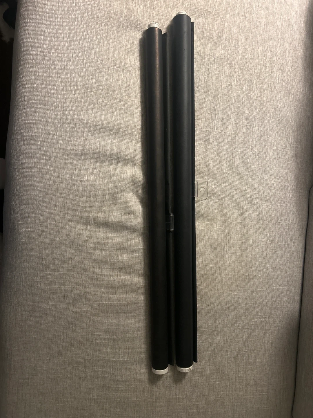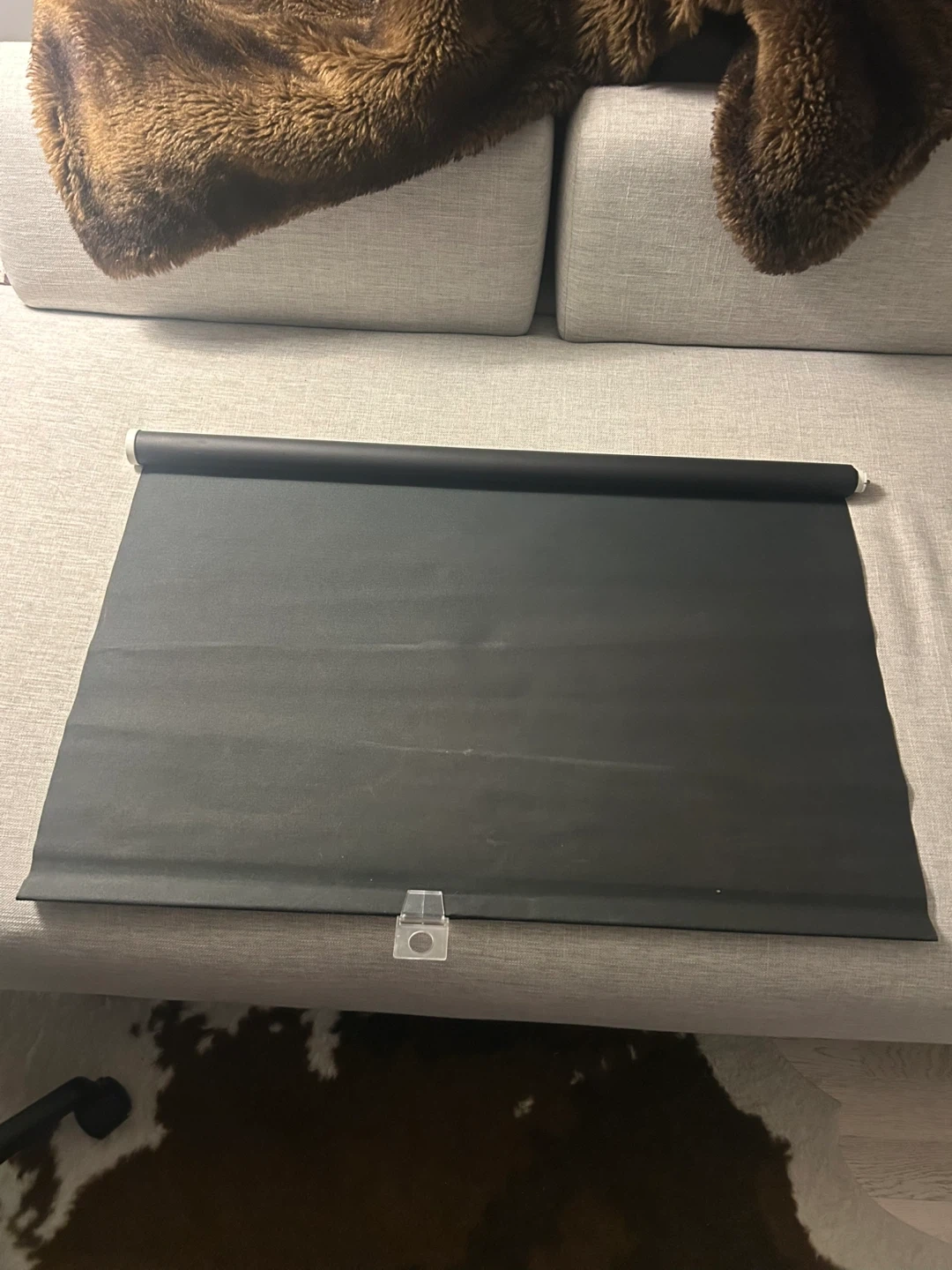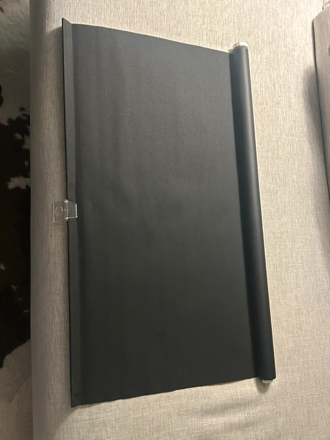 Two black roller blinds. 33.75” x 77” and 32.5” x 77” It comes with metal mounting brackets and white plastic covers. 25 for 1 or 40 for both.